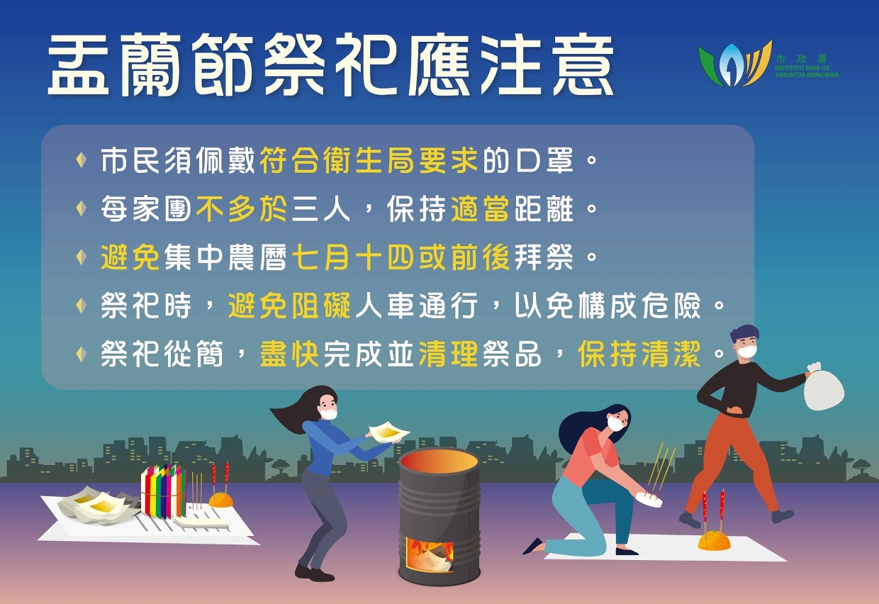 盂兰节期间,市政署除协调外判清洁公司加派人手,保持公共地方清洁外,亦会加派稽查人员进行巡查及劝喻市民遵循卫生部门防疫指引,而根据《公共地方总规章》,因祭祀而妨碍车辆或行人通行,或在祭祀后不清理有关地方,又或于不适当地点或容器内焚烧冥镪等,可被检控。
