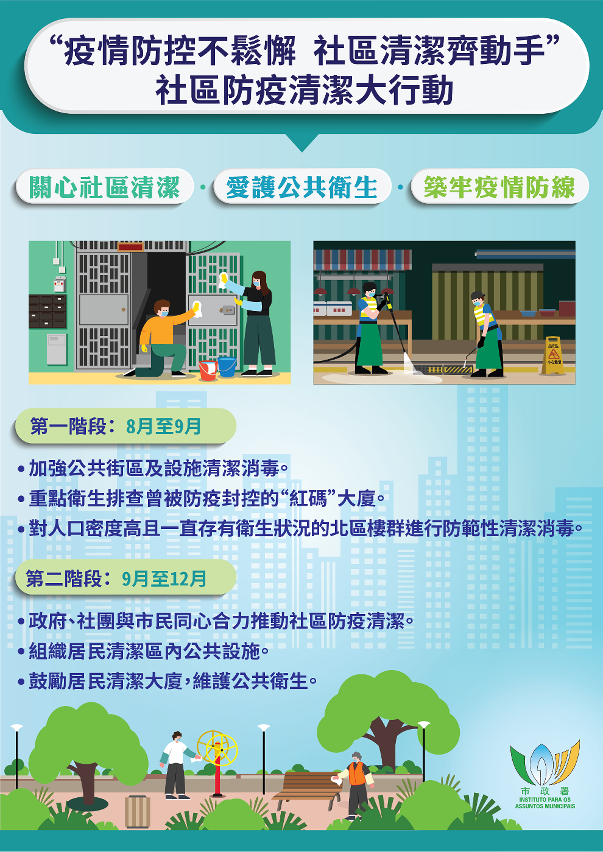 第二阶段的社区防疫清洁大行动由九月至十二月期间,透过政府、社团与市民三方联动,携手落实及执行各项公共卫生措施。届时,市政署将联同多个社团在本澳各区开展社区防疫清洁活动,组织居民对区内公共设施进行清抹、清扫等,提高大众防疫及公共卫生意识。同时加强宣传教育,鼓励居民从自身出发,主动清洁居住大厦环境,改善并持续维护公共卫生,组建健康大厦,以防疫情反弹。