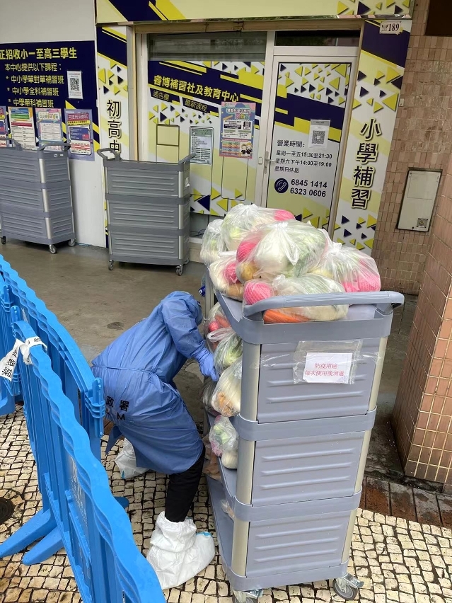 本澳现正悬挂三号风球,维生支援小组今(9日)向防疫封控中的保利达花园(第一座)住户多派发两天份量的蔬菜冻肉食物包或应急食物包,用作打风期间未能上门派送食物时的储备食粮,满足居民基本膳食需要。