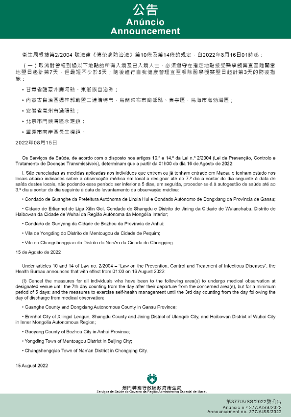 新型冠状病毒感染应变协调中心(下称应变协调中心)宣布,因应内地的疫情变化,卫生局根据第2/2004号法律《传染病防治法》第10条和第14条的规定,自2022年8月16日凌晨1时起,新增或取消对曾到内地相关区域人士的防疫措施: