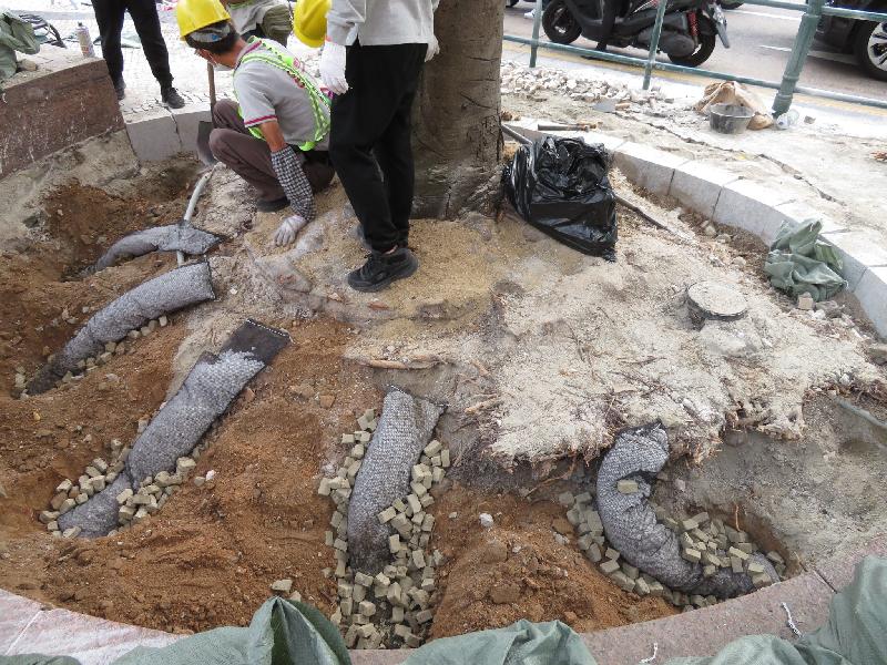 市政署树木养护人员持续采取一系列养护措施,救治一株位于议事亭前地感染根腐病的阴香树。