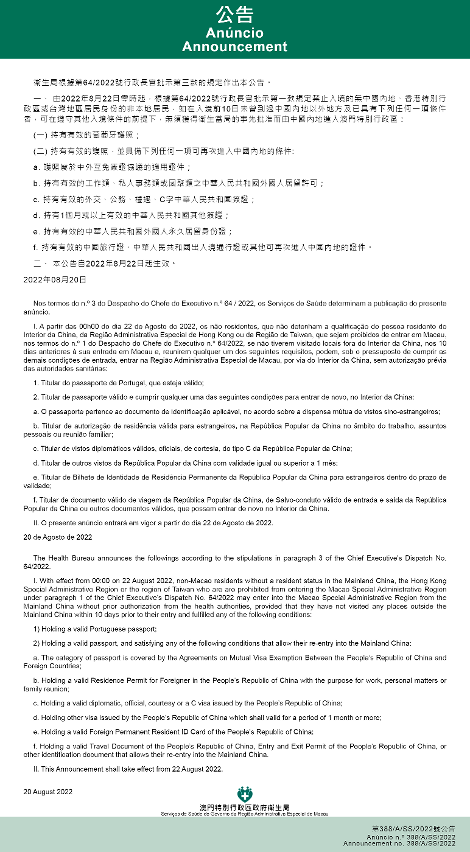 新型冠状病毒感染应变协调中心宣布,经考虑本地的实际需要及评估相关国家的疫情风险和变化后,卫生局作出第388/A/SS/2022号公告,根据第64/2022号行政长官批示第三款的规定,由2022年8月22日零时起,无中国内地、香港特别行政区或台湾地区居民身份的非本地居民,如在入境前10日未曾到过中国内地以外地方及具备任何一项可不必再申请签证即可返回中国内地的条件者,可在遵守其他入境条件的前提下,无须获得卫生当局的事先批准而由中国内地进入澳门特别行政区。但持有有效的葡萄牙护照者,不必具备可返回中国内地的条件,也可在遵守其他入境条件的前提下,无须获得卫生当局的事先批准而由中国内地进入澳门特别行政区入境。