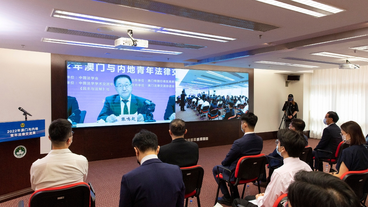 由中国法学会与法务局合办、澳门法律交流协进会支持的2022年“澳门与内地青年法律交流周”活动,于9月13日上午透过线上方式举行开班式及首场授课。中国法学会副会长兼秘书长张鸣起、澳门特区政府法务局局长刘德学、中央政府驻澳门联络办公室法律工作部副部长级助理黄文军、中国法学学术交流中心主任肖育斌、澳门法律交流协进会会长黄景禧,以及该会的青年法律工作者,澳门大学、澳门科技大学和澳门城市大学的法学院师生共约60人同时在北京、澳门两地参加是次开班仪式。