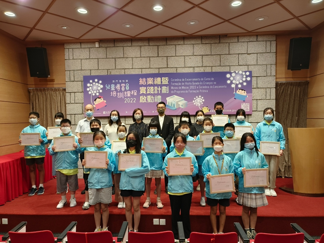 由文化局主办、澳门文化遗产协会承办的“2022年澳门博物馆儿童导赏员培训课程”于日前(9月17日)在澳门博物馆举行培训课程结业礼暨实践计划启动礼,由文化局文博厅厅长沈浩然、澳门博物馆馆长卢可茵、澳门文化遗产协会副会长方静雯、课程导师黄健威、冯紫云及黎彩玉出席主持启动仪式。