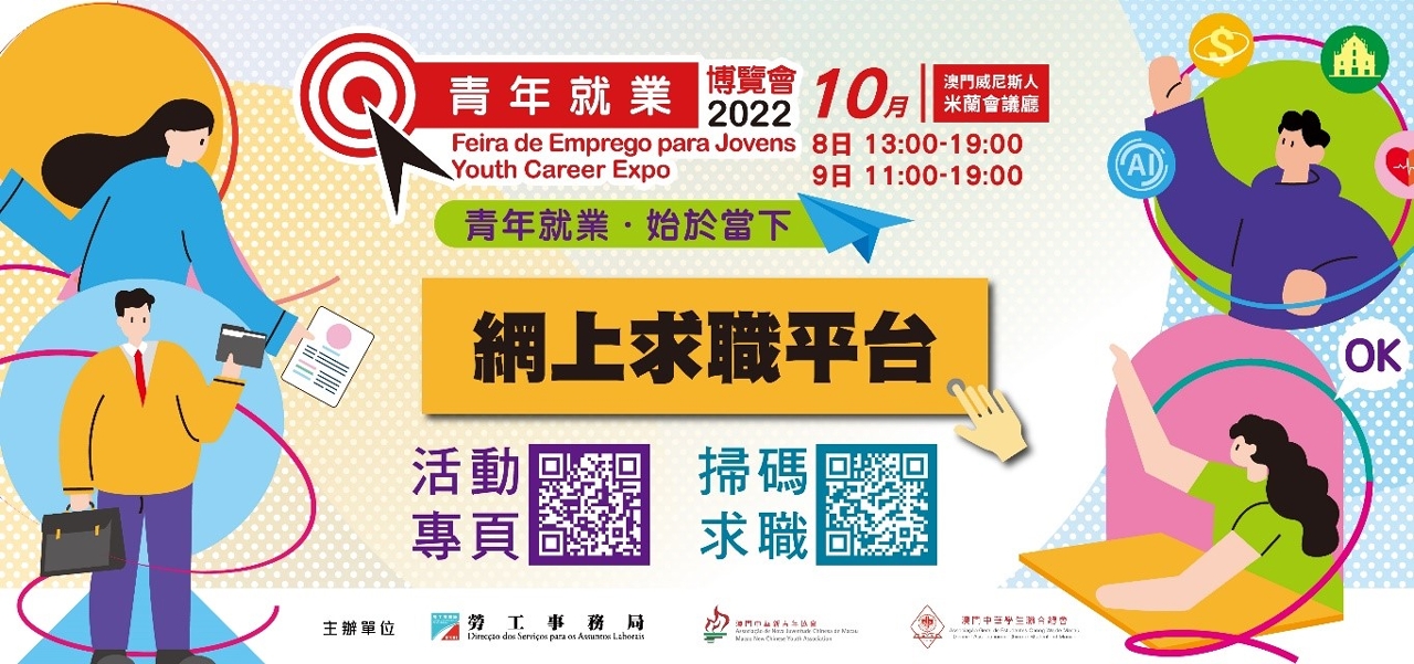 “青年就业博览会2022”于10月8及9日假澳门威尼斯人会议厅举行,一连两天设有20场专题讲座,内容丰富涉及四大产业,欢迎有兴趣的人士明(25)日起进行网上报名。
