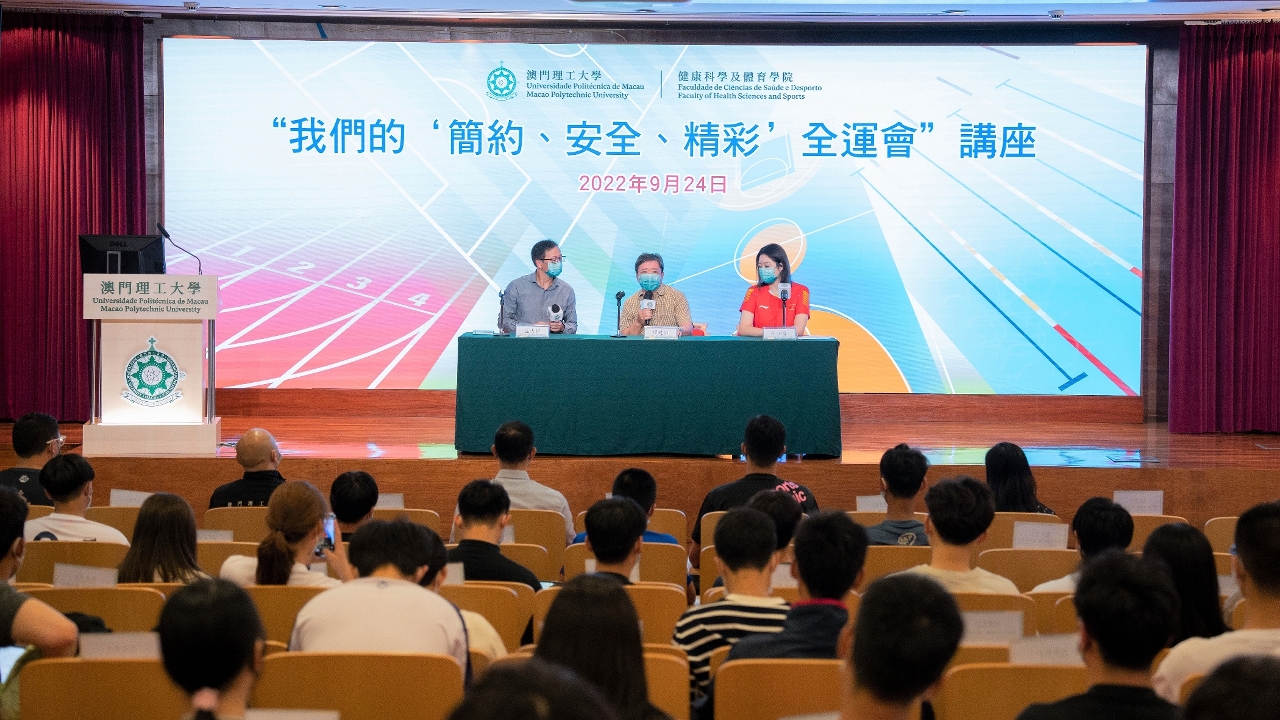 为迎接广东、香港、澳门承办的2025年第十五届全国运动会,澳门理工大学健康科学及体育学院于9月24日举办“我们的‘简约、安全、精彩’全运会”讲座,由华南师范大学体育科学学院教授谭建湘、澳门理工大学副教授区志权和实习讲师于小含主讲,以专家、教练、运动员的身份,鼓励大学生和青年积极参与大型体育赛事,全情投入全国运动会。