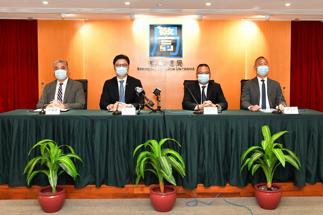 粤港澳三地警方联合警务行动—“雷霆2022”于今(7)日进行同步新闻发布,澳方于下午三时在警察总局举行发布会,警察总局局长助理黄志康、澳门海关助理关长李煜辉、治安警察局副局长梁庆康及司法警察局副局长梁文照出席,并在会上公布有关行动的统计数字,总结打撃成效。