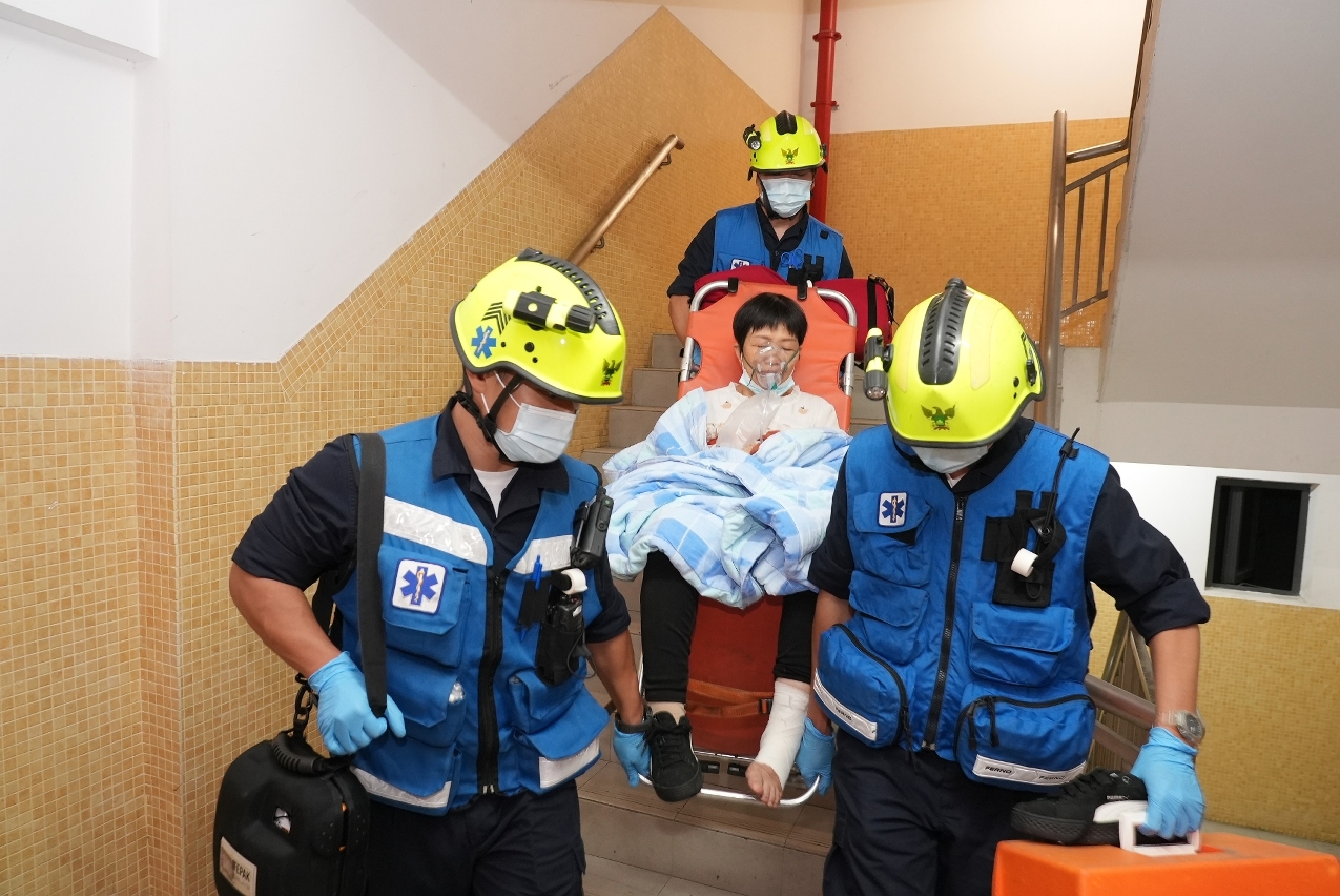 演习模拟新批发市场2楼卸货区位置有一架货车因故障突然起火冒烟,现场保安发现起火后尝试进行灭火,但未能扑灭,且由于火势蔓延到周边其他位置,故随即向上级通报。现场主管人员立即启动应急预案,以及按既定计划迅速撤离现场人员到逃生集合点,同时致电消防局及治安警察局求助。消防局接报后随即派遣7架救援车辆及35名消防人员赶赴现场展开灭火救援及疏散工作,同时联同市政署、治安警察局、交通事务局及南粤鲜活商品批发市场有限公司之代表组成临时联合指挥站,并安排队员于集合点协助清点疏散人数。期间有一名人士于疏散期间不慎跌倒受伤,经救护员护理后模拟送院治理。