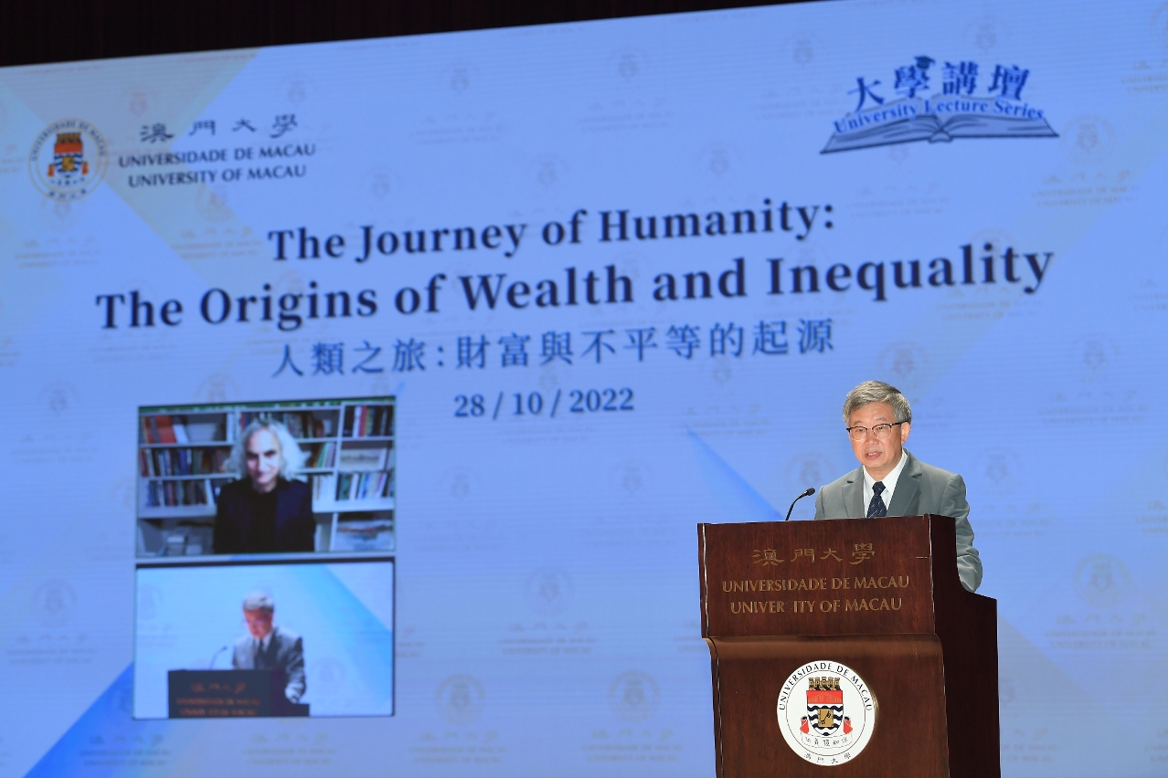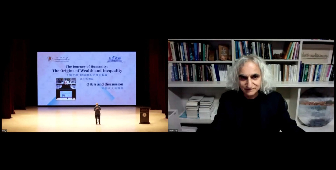 澳门大学今(28)日举行“大学讲坛"讲座,由着名经济学家奥戴德·盖勒(Oded Galor) 担任讲者,就“人类之旅:财富与不平等的起源”为题发表演说,探讨人类文明数项重大课题诸如发展、贫穷、增长、财富、不平等之间的关系。讲座线上线下同步举行,出席者众多,讨论气氛热烈。