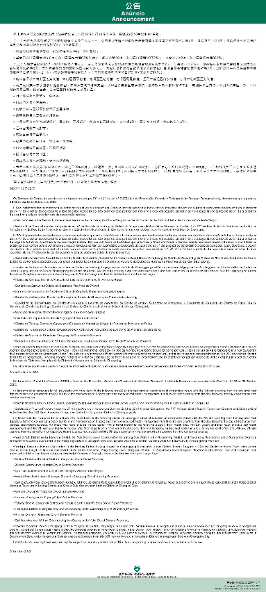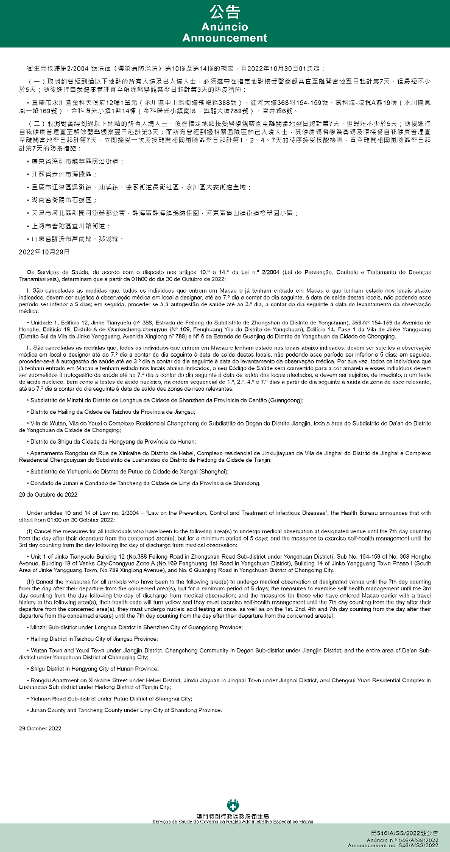 新型冠状病毒感染应变协调中心(下称应变协调中心)宣布,因应内地的疫情变化,卫生局根据第2/2004号法律《传染病防治法》第10条和第14条的规定,自2022年10月30日凌晨1时起,新增或取消对曾到内地相关区域人士的防疫措施: