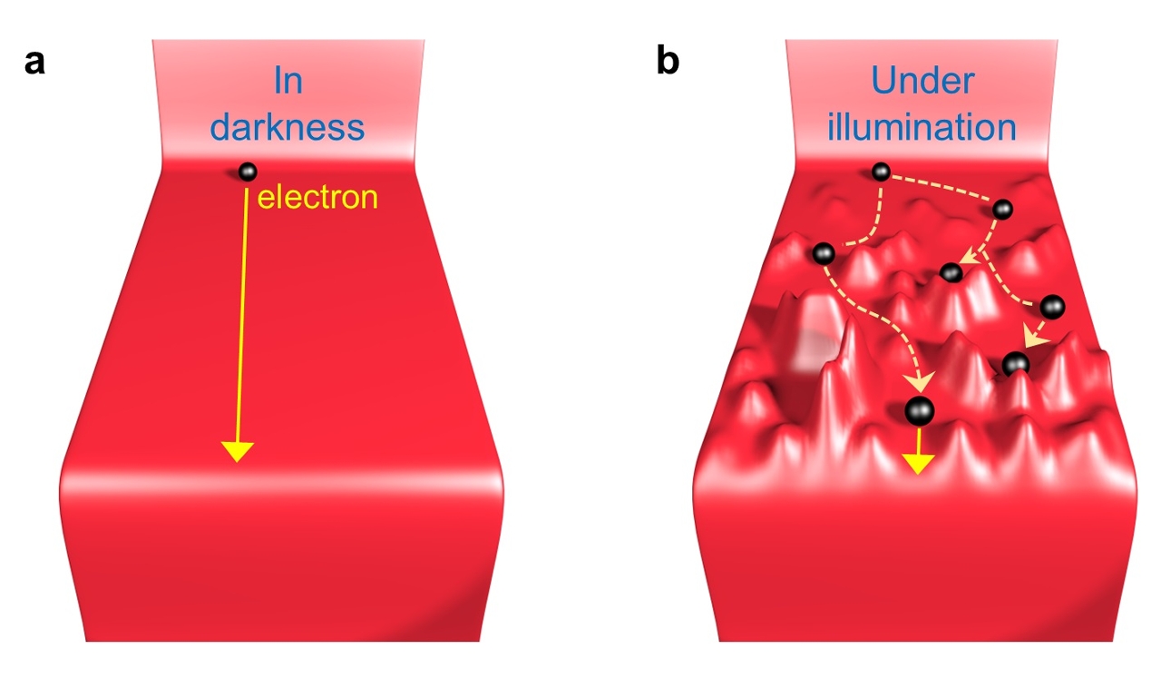 有鉴于此,两校的研究团队进行研究并首次揭示了混合二维/三维钙钛矿体系中独特的光致载流子阻塞效应。研究发现,在黑暗条件下,二维钙钛矿组分不会阻碍载流子的传输;而在光照条件下,二维/三维钙钛矿界面的内建电场会增强,结合其镶嵌式的相分布规律,导致光生电子的传输被光致势垒阻碍,而光生空穴则被光生陷阱俘获。这一机制很好地解释了混合二维/三维钙钛矿太阳能电池短路电流和填充因子低的现象。这一机制的提出,为优化混合二维/三维钙钛矿太阳能电池的性能提供了新的理论指导。