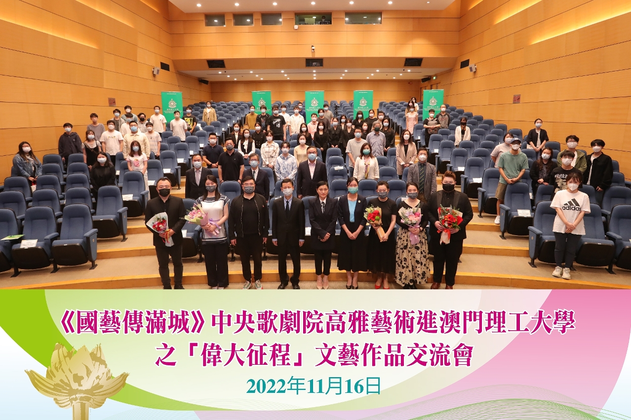 《国艺传满城》中央歌剧院高雅艺术进澳门理工大学之“伟大征程”文艺作品交流会于11月16日下午三时在澳理大礼堂举行,中联办宣文部副部长殷汝涛、国家一级演员、中央歌剧院副院长么红、国家一级演员、中央歌剧院主任张鹏、澳门理工大学副校长李雁莲、文化局代表澳门演艺学院院长周游、教青局学生厅厅长陈旭伟、澳门理工大学艺术及设计学院院长黎明海、音乐课程主任代百生、音乐课程副教授梁咏茜、公共关系办公室主任陈玉玲等嘉宾与师生们一起欣赏交流会。
