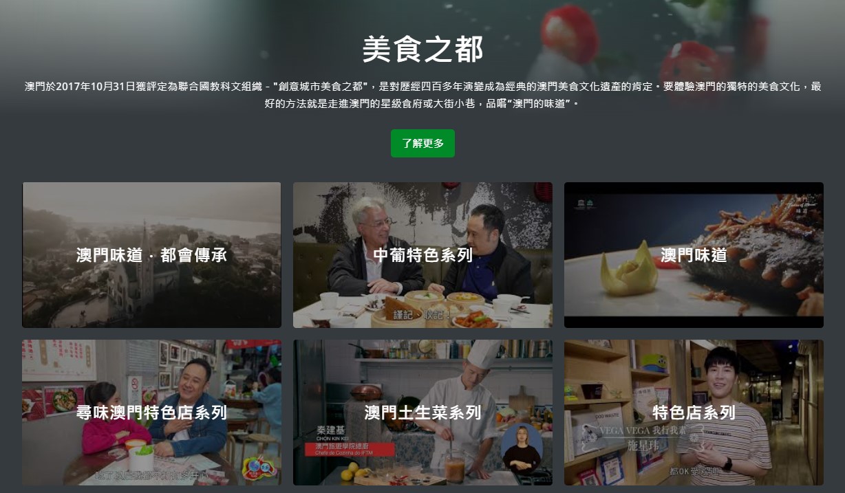全新的“美食之旅”在原有网页的基础上,整合并加入丰富影片及内容,包括“澳门味道•都会传承”、“中葡特色系列”、“澳门味道”、“寻味澳门特色店系列”和“澳门土生菜系列”等短片特辑,为使用者分门别类,方便搜罗澳门各类美食。期望通过影片形式,旅客可一边寻找让味蕾跳动的盛宴,一边了解其背后故事,进一步认识澳门“创意城市美食之都”的内涵。