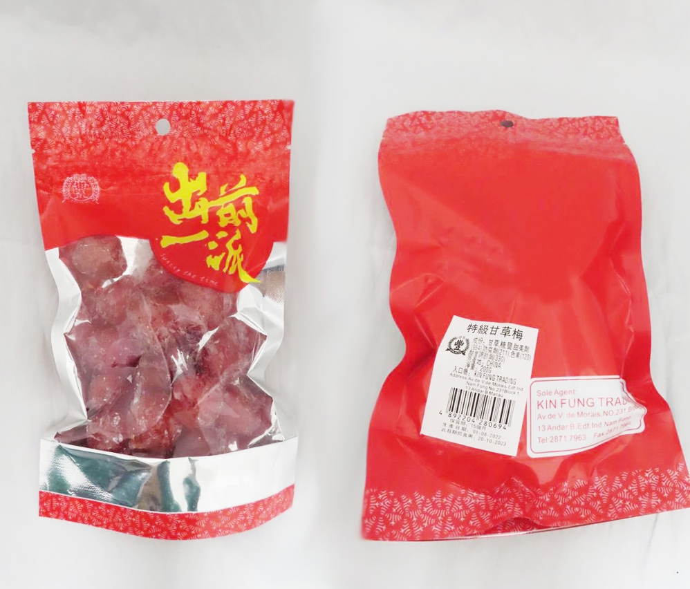 涉事三款的预包装食品分别抽取自本澳三间超级市场,其中“三角牌”金针菜,标示批次之最佳食用期为2024年3月18日;“出前一派”特级甘草梅,标示批次之生产日期为01-08-2022,此日期前食用为20-10-2023;上述两款食品分别检出每公斤含一点二五克及每公斤含一点一二克的二氧化硫,均超出本澳《食品中防腐剂及抗氧化剂使用标准》的规定。另一款“Mag Mag”还魂梅(雪梅),所标示之批次为MFG 26 08 2022,EXP 26 08 2023,检出甜味剂纽甜的含量为每公斤一百一十毫克,超出本澳《食品中甜味剂使用标准》之规定。