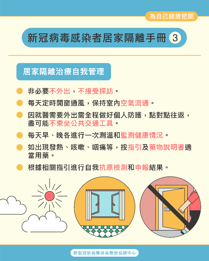“居家隔离资讯网”内容包括居家隔离条件、居家治疗指引、居家隔离期间检测要求、感染者社区门诊资讯和预约方法、对同住人的要求、家居卫生清洁、生活资讯、网上学习资源、饮食参考、查询渠道等资讯。有需要人士可查阅https://iasapp4.ias.gov.mo/homeQuarantine/ ,了解相关资讯。