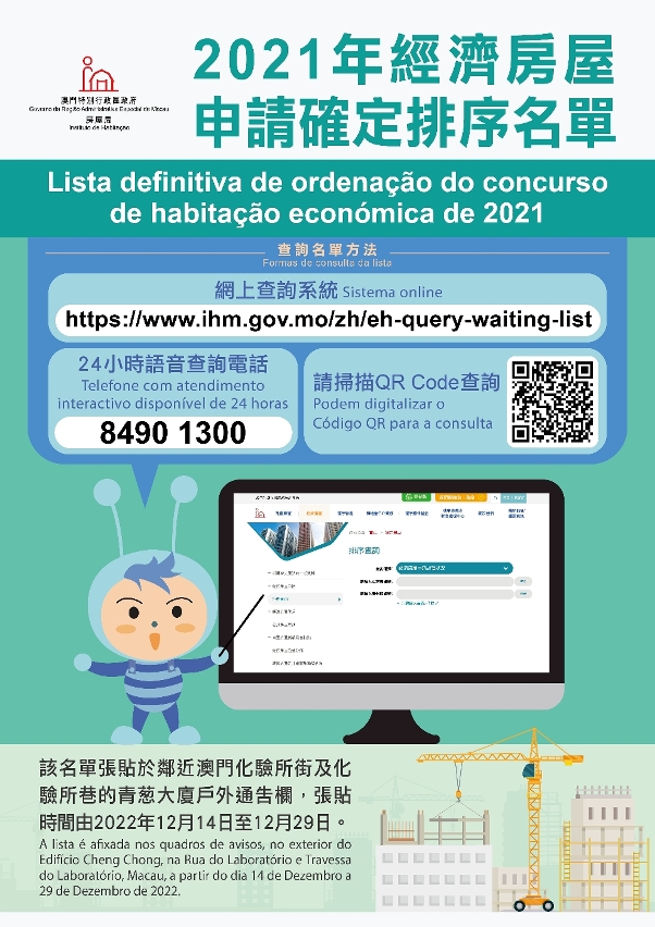 因应防疫安排,房屋局呼吁申请人善用网上查询系统(https://www.ihm.gov.mo/zh/eh-query-waiting-list)、微信及24小时语音电话(8490 1300)查询申请情况。而选择现场查阅名单之人士,必须佩戴口罩及出示个人健康码。