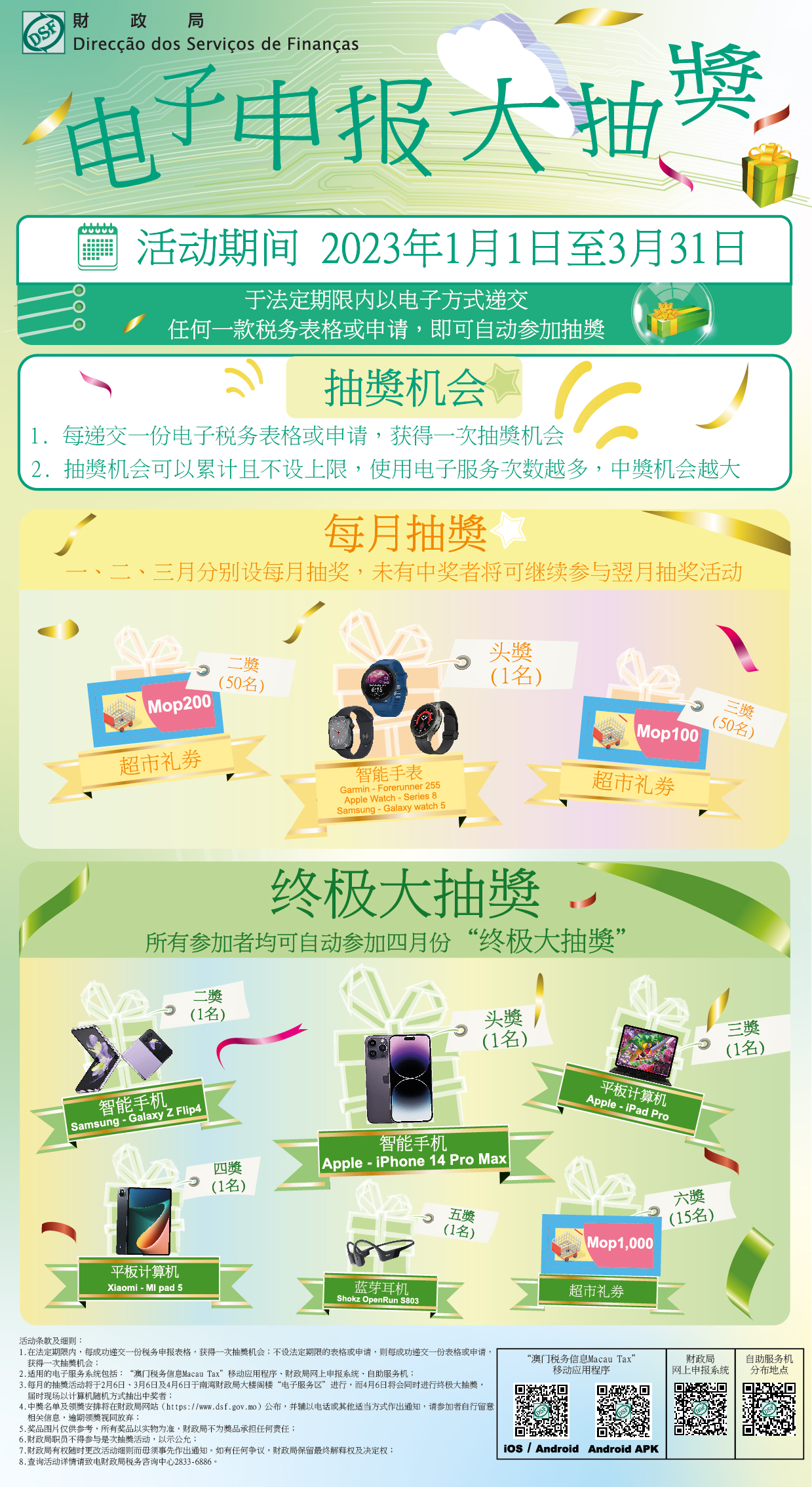 每月的抽奬活动将于2月6日、3月6日及4月6日于南湾财政局大楼阁楼“电子服务区”进行,而4月6日将会同时进行终极大抽奬。届时会以电脑随机方式抽出中奖者,中奬名单及领奬安排将于财政局网站(https://www.dsf.gov.mo)公布,并辅以电话或其他适当方式作出通知。