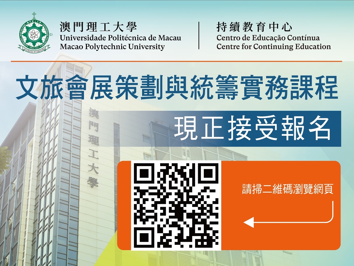 澳理大持续教育中心去年开办“文旅会展策划与统筹实务”课程,深受学员欢迎,近期将再次开办。课程内容包括认识会展分类,设计会展概念,会展计划的策划、统筹和评估,资讯科技应用,执行会展计划过程中的物流管理、预算监控、风险管理等,将由资深会展业界人士任教,分享实际从业经验和个案研讨,并探讨国际会展业未来趋势。