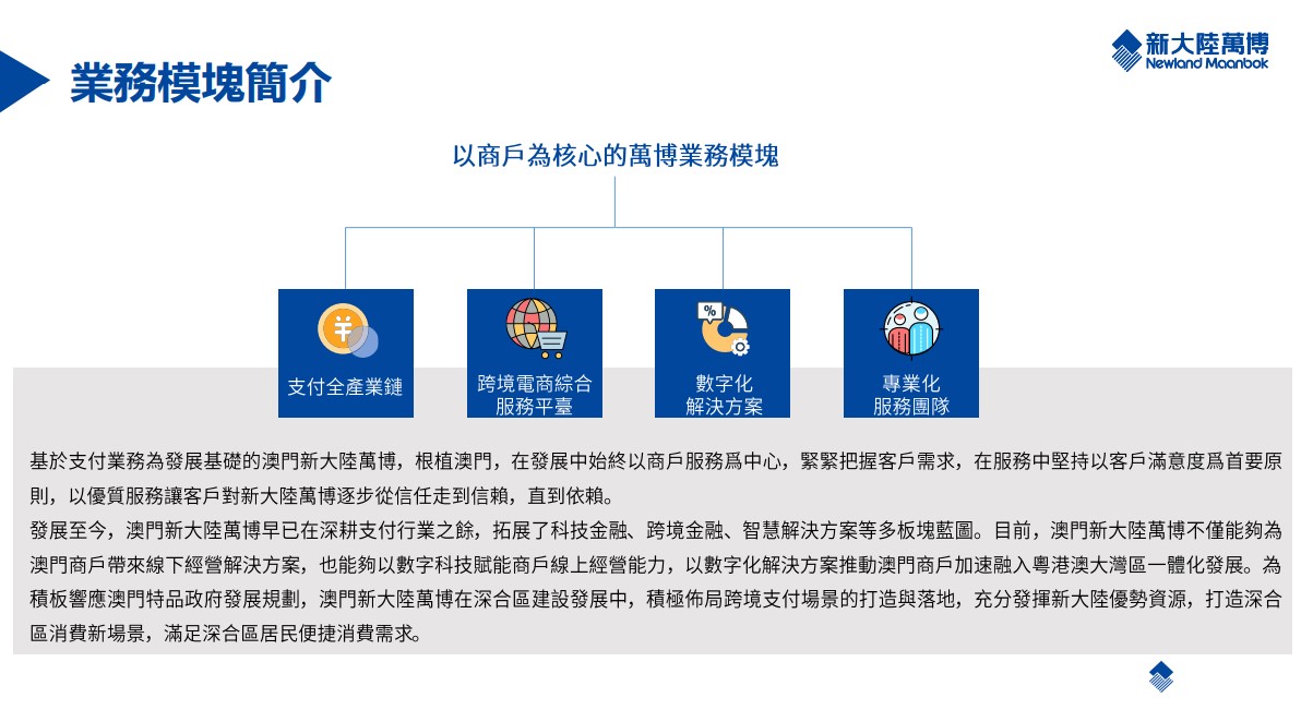 新大陆万博是新大陆科技集团全球化布局子公司,扎根澳门8年并发展成为澳门特区具影响力的综合性高新科技企业之一,为澳门大小商户提供线上线下全方位支付解决方案。为扶持中小企业发展,助力澳门跨境电商产业布局发展,近年成立新大陆全球购跨境电商有限公司,打造澳门科技电商服务平台「万博荟」,赋能澳门中小企业线上营销能力。