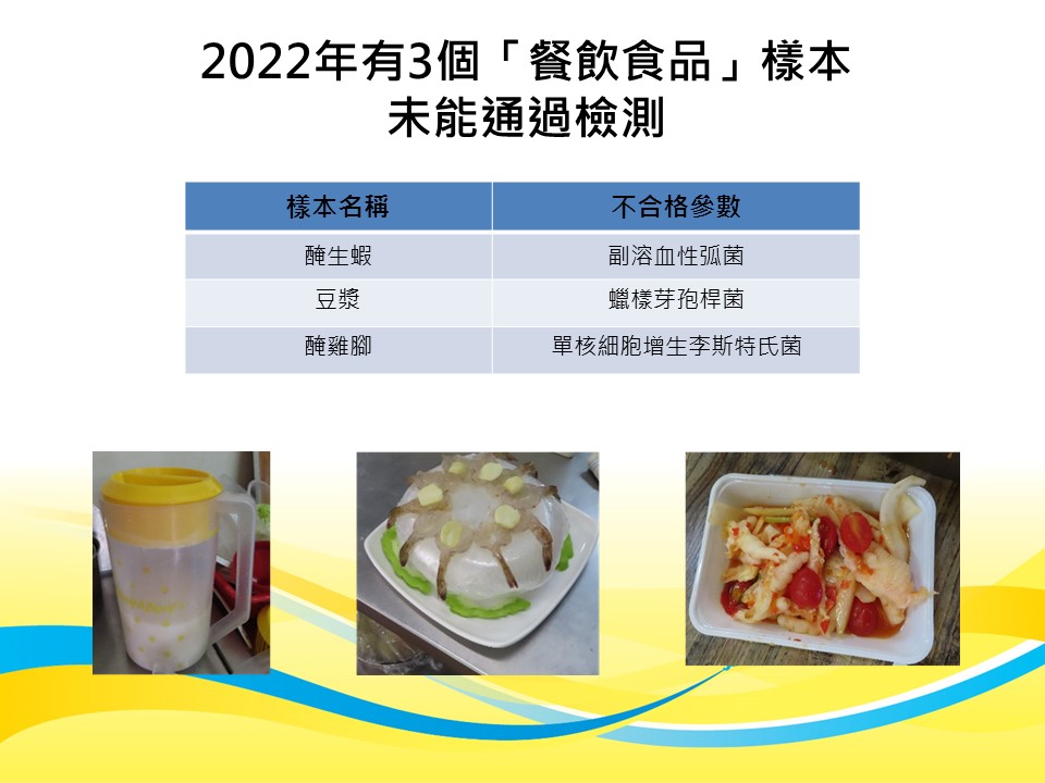 总结二零二二年全年,市政署在市面共抽取了三千三百五十三个食品样本进行检测,包括一百七十个时令节日食品样本和三千一百八十三个常规抽检食品样本,当中有七个“贺年食品”样本未能通过检测;另外有三个“餐饮食品”和十三个“一般市售食品”未能通过检测,整体合格率达百分之九十九点三。