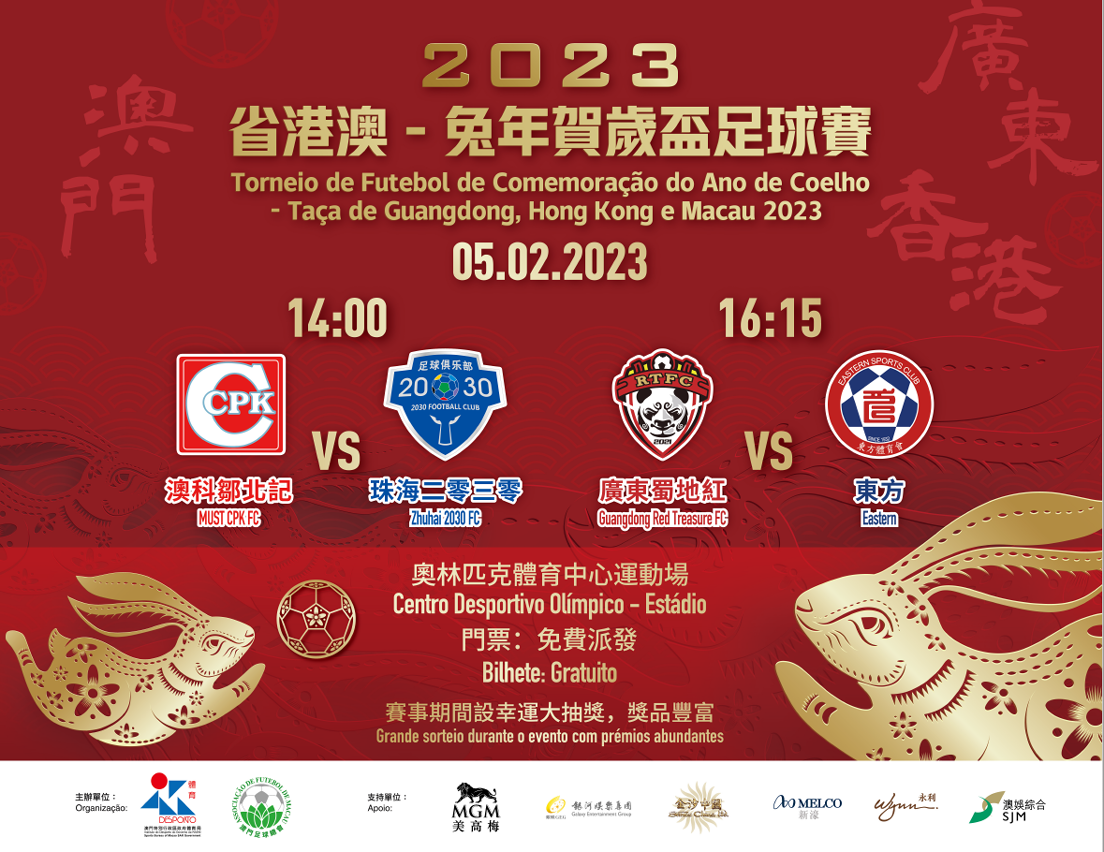 为与市民喜迎癸卯兔年,欢度新春佳节,由体育局与澳门足球总会合办的“2023省港澳-兔年贺岁杯足球赛”将于本年2月5日在奥林匹克体育中心运动场举行,赛事当天下午2时率先由澳科邹北记对珠海2030,紧接4时15分由广东蜀地红对东方。