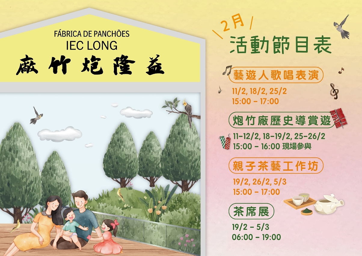 文化局将于2月期间逢周末在益隆炮竹厂旧址举办多项特色活动,包括艺游人音乐表演、亲子茶艺工作坊及炮竹厂历史导赏游等,持续丰富园区的体验元素,让市民旅客在绿意环抱的炮竹厂旧址,共度艺文相伴的悠然时光。