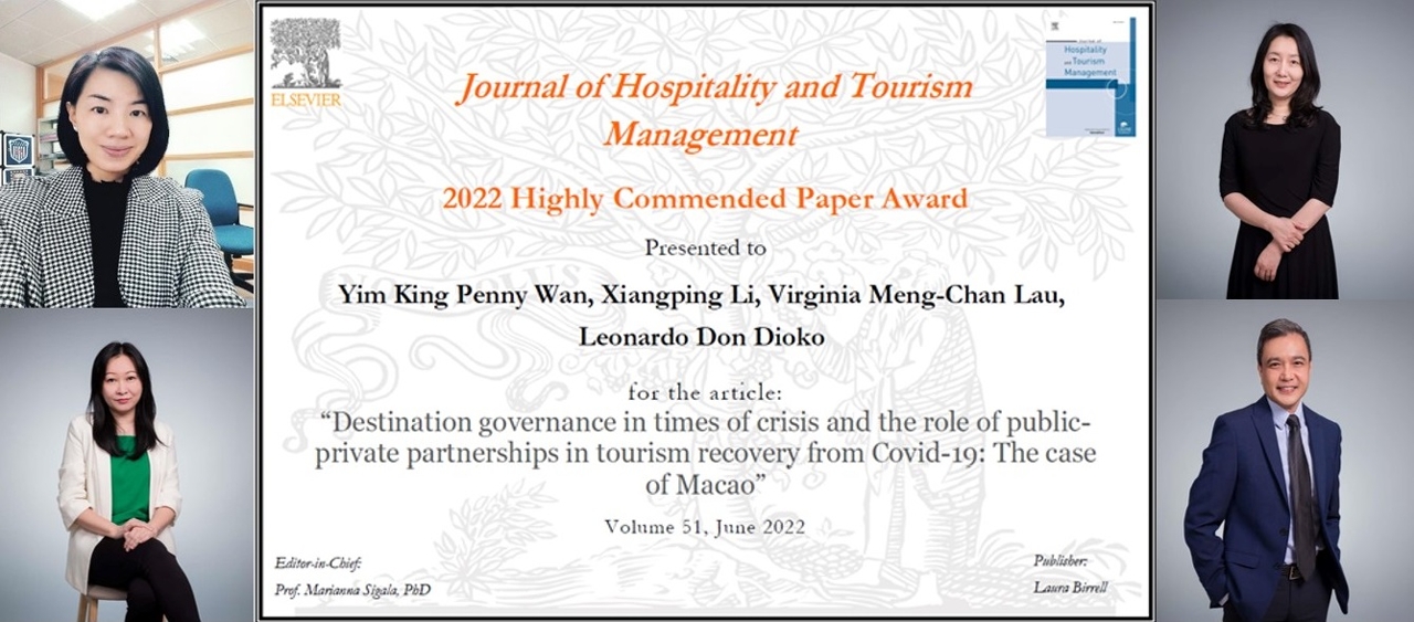 澳门旅游学院温艳琼博士、李湘萍博士、刘名珍博士和李力东教授,荣获权威期刊《酒店与旅游管理》(Journal of Hospitality and Tourism Management) 颁发的 2022 年高度推荐论文奖。《酒店与旅游管理》 于2022 年 SSCI 影响因子为7.629,在澳大利亚商学院院长委员会 (Australian Business Deans Council) 期刊质量列表中被评为“A”级。期刊颁发三个年度奖项,以表彰和鼓励高质量的研究成果,其中包括一个最佳论文奖和两个高度推荐论文奖。编辑团队根据定量分析(包括已发表论文的使用统计和 Scopus 引用计数)和论文对研究领域贡献的定性评估来挑选优秀论文。