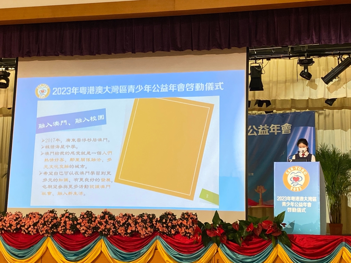 澳门海星中学高二年级学生梁倩盈于“年会”上作澳门青少年代表分享参与公益活动经验表示,自己身处一个繁荣的时代,既是未来的见证者、参与者,更是建设者,通过参与公益活动履行社会责任,在帮助他人时完善自我是最好的成长方式。
