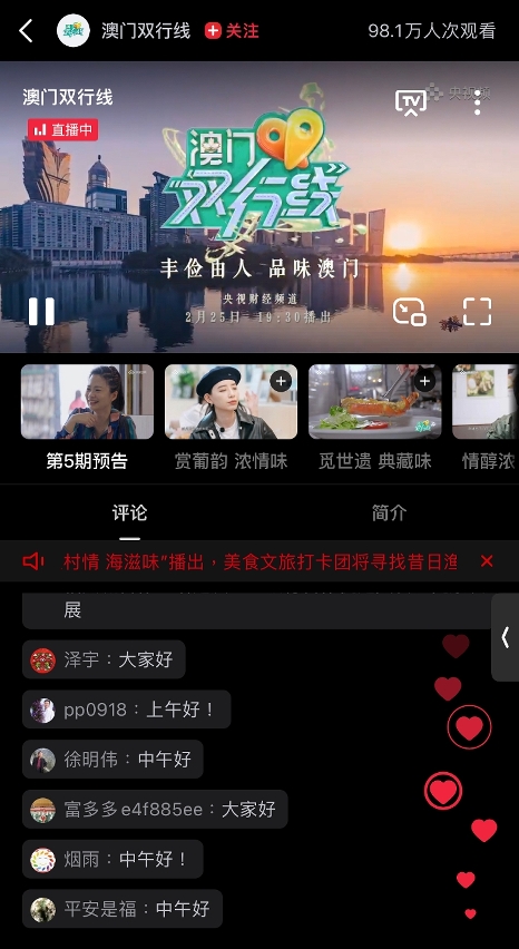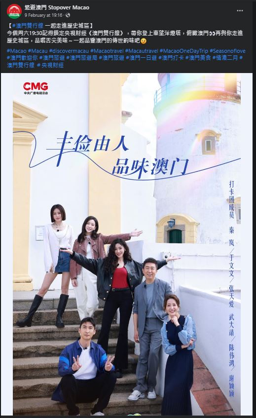 旅游局积极配合并为此重要美食文旅节目铺排宣传。由去年11月至今年2月23日旅游局在官方微信、微信视频号、微博、抖音、小红书、脸书及Instagram各平台的相关宣传曝光量超过4,459.4万,显示澳门旅游美食节目受到广泛关注及好评。此外,澳门相关政府部门及本地媒体亦透过各网上渠道共同宣传。
