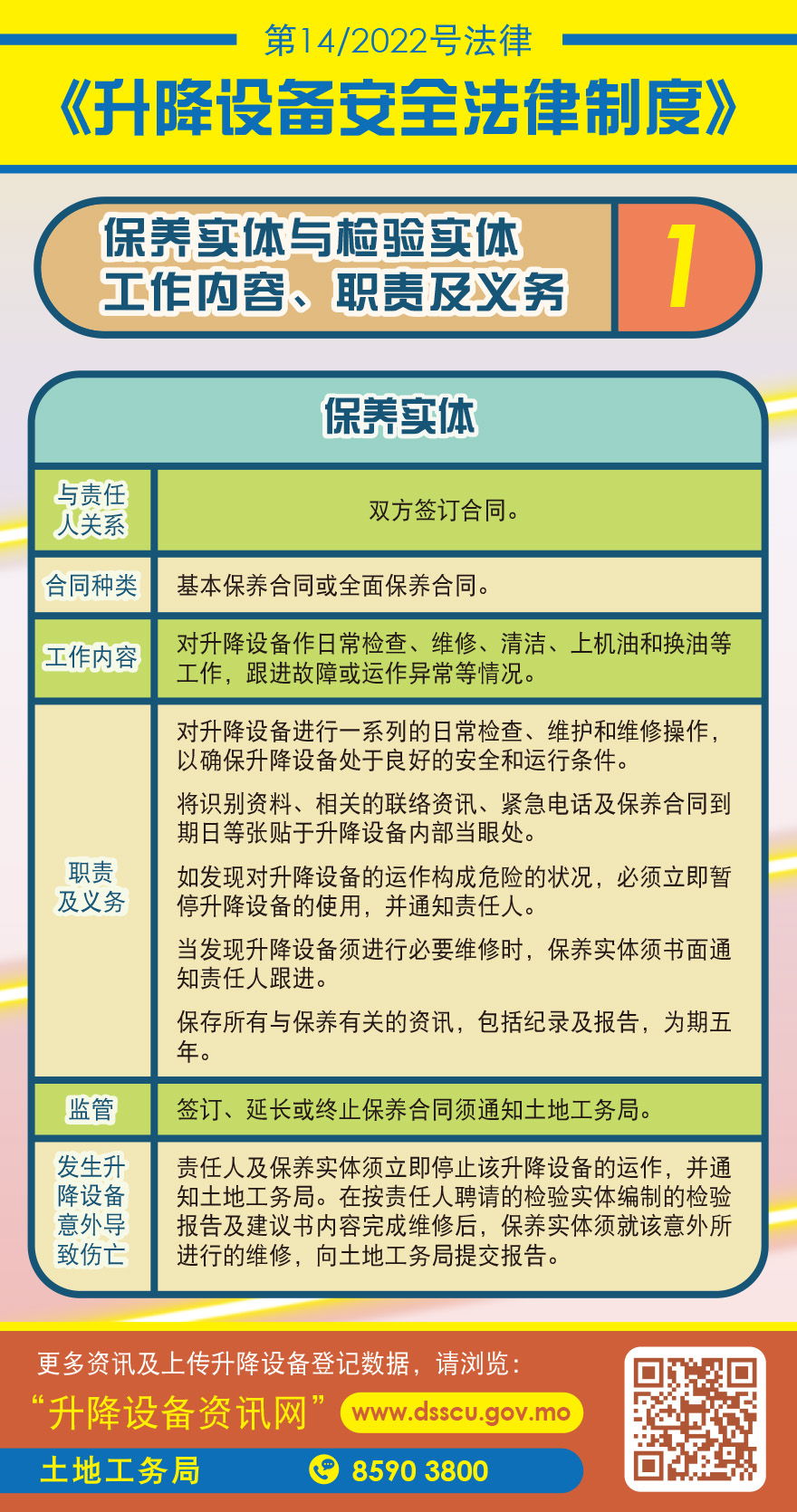 升降设备的安全关系到千家万户,因此对相关设备作定期保养及检验至关重要。第14/2022号法律《升降设备安全法律制度》透过制度化及规范化管理,令升降设备的使用更有安全保障,包括明确由合资格的保养实体负责对升降设备作恒常的维修保养,并由专业检验实体作每年一次定期检验等工作。