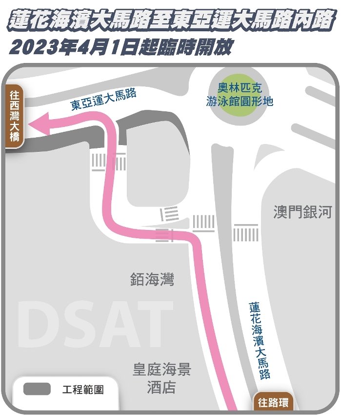 配合奥林匹克游泳馆圆形地行车天桥西南匝道桥建造工程,4月1日(周六)起,连接莲花海滨大马路与东亚运大马路之内路临时开放,以减少往圆形地之车流。由莲花海滨大马路往西湾大桥方向之车辆,可于近銆海湾位置左转,经由上述内路驶往东亚运大马路。
