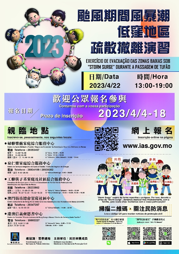 为强化本澳防灾应急的联动能力,持续提升社会大众的忧患意识,民防架构将于4月22日(星期六)举行代号“水晶鱼2023”民防演习,届时将会模拟执行“台风期间风暴潮低洼地区疏散撤离计划”,并邀请市民共同进行实地演练,以深化市民大众对疏散撤离的认知,提升协作精神。