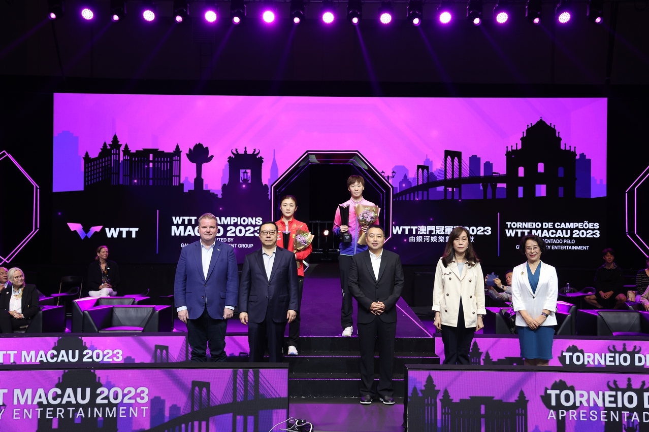 由体育局、世界乒乓球职业大联盟(WTT)及银河娱乐集团主办、澳门乒乓总会协办的「WTT 澳门冠军赛 2023 ─ 由银河娱乐集团呈献」,今日(23日)于塔石体育馆上演冠军争夺战,男、女单打冠军分别由王楚钦及王曼昱夺得。澳门特别行政区代理行政长官张永春出席活动观赏赛事,并担任颁奖嘉宾。