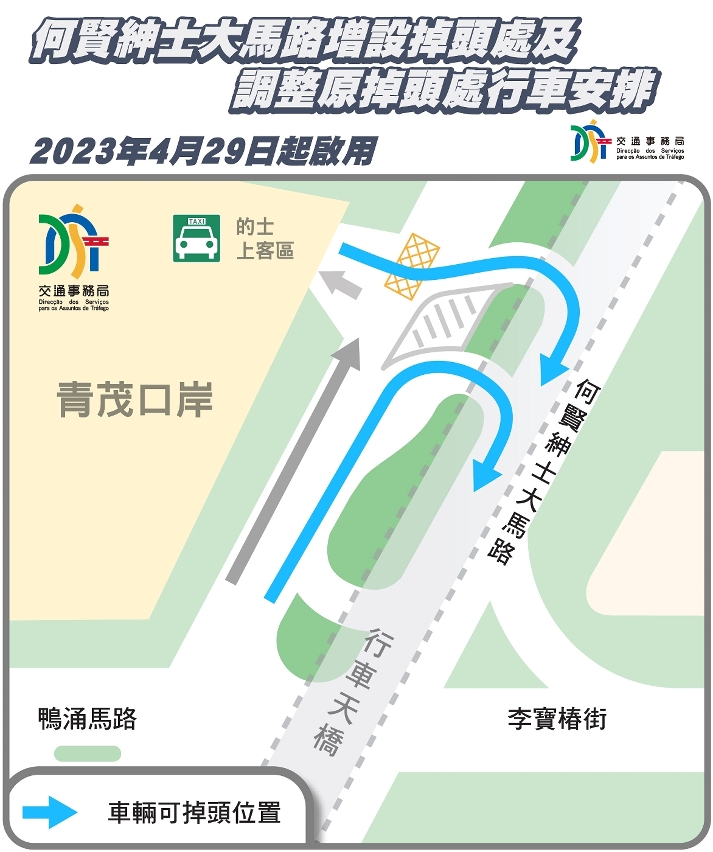另外,为优化青茂口岸周边的行车交通,经评估现场条件,将于何贤绅士大马路行车天桥下的绿化带位置增设一个掉头处,供鸭涌马路方向之车辆掉头驶往筷子基一带,改善该处原有掉头处大型车辆转向困难及交通视线不佳等情况;同时,调整青茂口岸的士上客区出入口位置的行车安排,允许由的士上客区驶出之车辆,可使用原掉头处掉头,减少现时的士往筷子基方向需绕道较远的情况。改善工程正积极开展,预计4月29日(周六)下午完成后随即投入使用。同时,何贤绅士大马路往筷子基方向近行人天桥落脚点位置及附近路段已加装视频监察系统,以便实时监控周边道路情况。