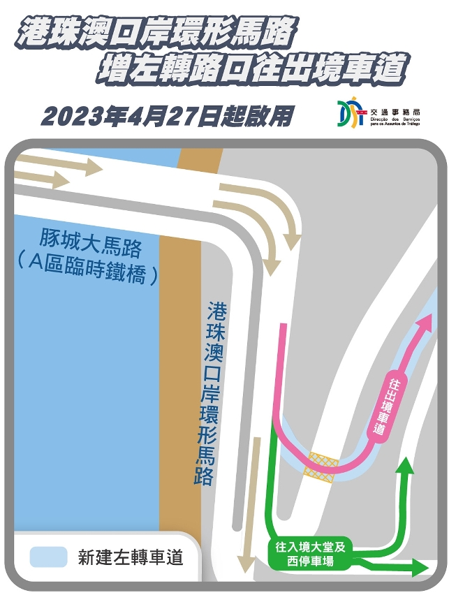 为优化道路交通规划,配合市民的出行交通需要,交通事务局正于港珠澳及青茂口岸周边开展道路改善工程。当中,为优化进出港珠澳大桥口岸人工岛道路的通行条件,港珠澳口岸环形马路左侧车道旁绿化带位置开辟出一个左转路口(详见附图),供车辆可直接驶往出境车道,相关路口今日(27日)启用。另外,豚城大马路将于公共建设局完成路面扩宽工程后改为双向四线行车、豚城大马路往港珠澳口岸环形马路的右转路段改为双线行车、马万祺博士大马路往濠江圆形地方向约120米道路改为双线车道,以提升进入口岸的车道通行能力,减少出境车辆等候通关而做成的拥塞情况。相关改善工程视天气状况,预期于4月28日(周五)完成工程后陆续投入使用。