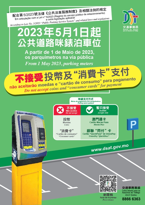 为配合第5/2023号法律《公共泊车服务制度》及相关法例的规定,公共道路泊车位收费系统(俗称“咪表”)由2023年5月1日起不再接受现金及“消费卡”的支付方式,公众可继续沿用澳门通或银联“闪付”系统支付咪表的泊车费。