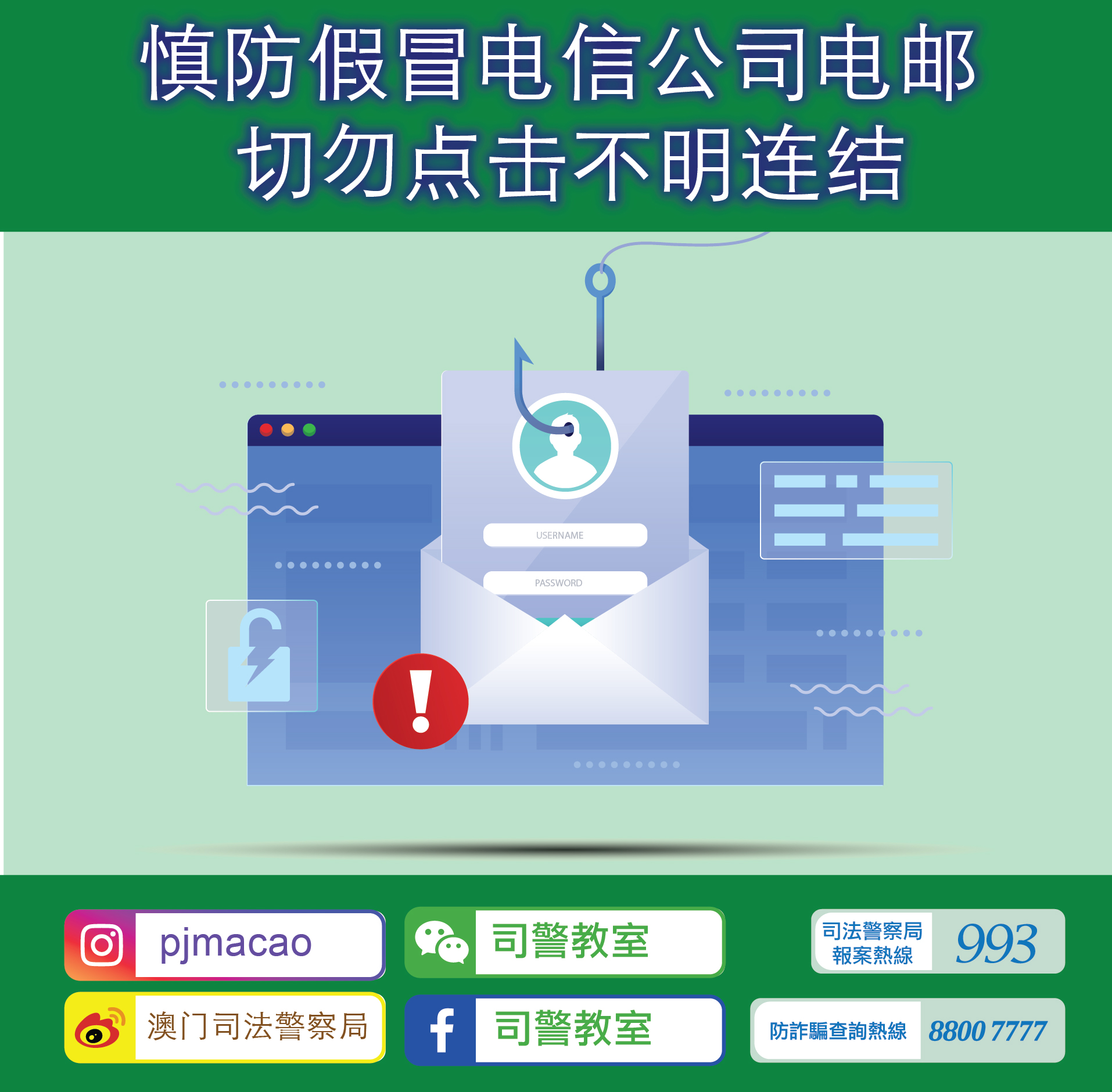 鉴于早前亦曾发生假冒电讯公司的电信诈骗案,故司警局呼吁市民须提高警惕,如接获类似电邮,应直接向相关机构核实求证,切勿开启来历不明的电子邮件及附件,以防手机或电脑系统被病毒入侵。