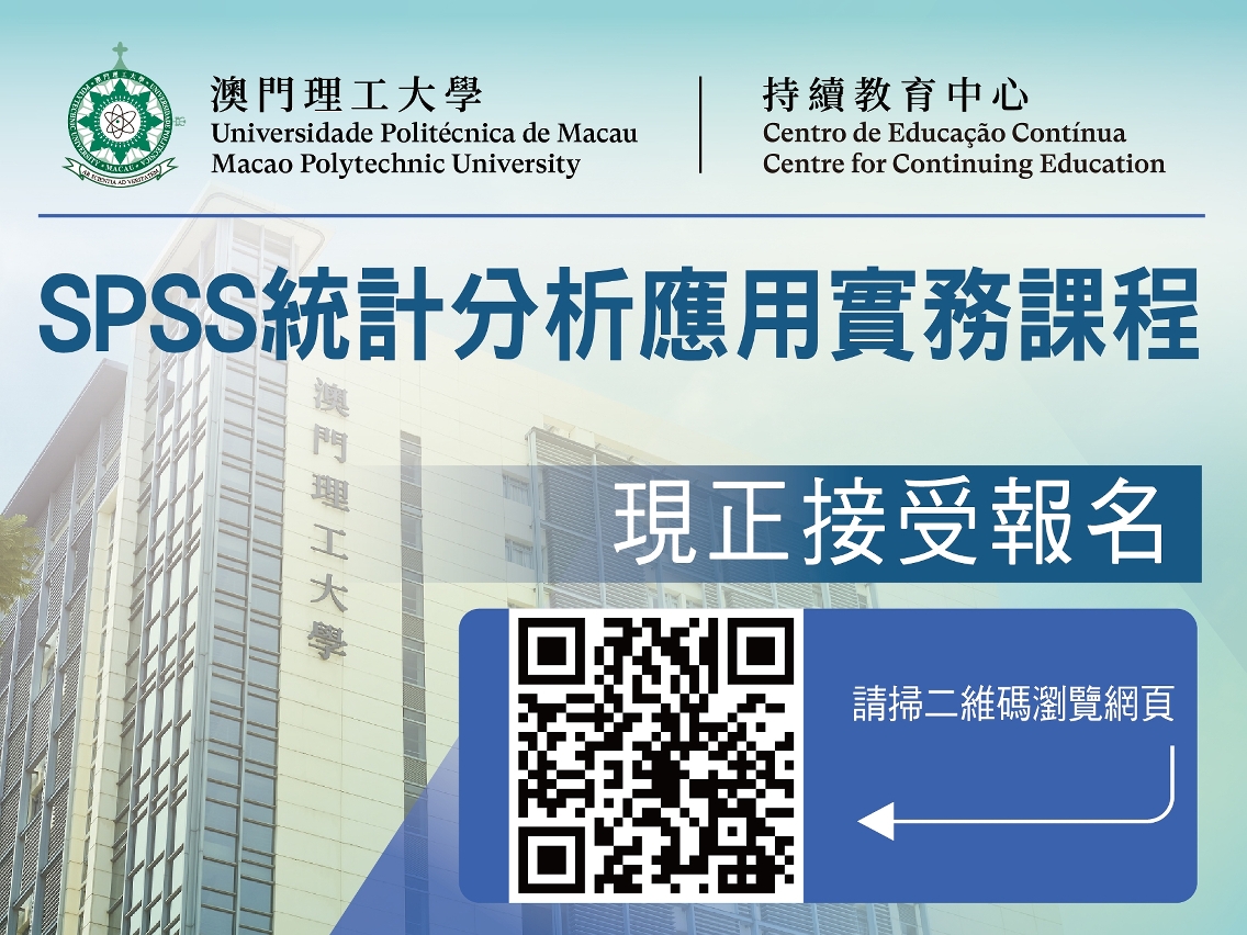“SPSS统计分析应用实务”课程内容包括量化研究概念、SPSS数据预处理、母数推论统计的平均数比较、无母数统计、积差相关分析、线性回归分析及应用、问卷中量表的信效度分析,导师将以应用个案分析及示范操作,深入浅出引导学员掌握操作实务。课程适合认识基本电脑操作并具基本统计知识的人士报读。课程以广东话授课,可使用教育及青年发展局持续进修发展计划个人进修帐户支付。出席率达总课时85%可获由澳门理工大学持续教育中心发出的证书。