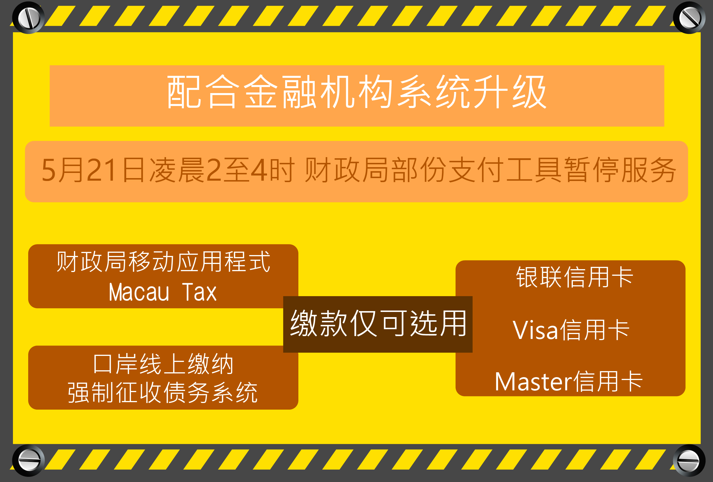 配合金融机构系统升级,5月21日凌晨2时至4时,倘经财政局移动应用程式“Macau Tax”及“口岸线上缴纳强制征收债务系统”缴款,仅可选用“银联信用卡”、“Visa信用卡”、“Master信用卡”进行缴付,不便之处,敬请见谅。相关系统升级工作完成后将恢复正常缴付服务,敬请留意。