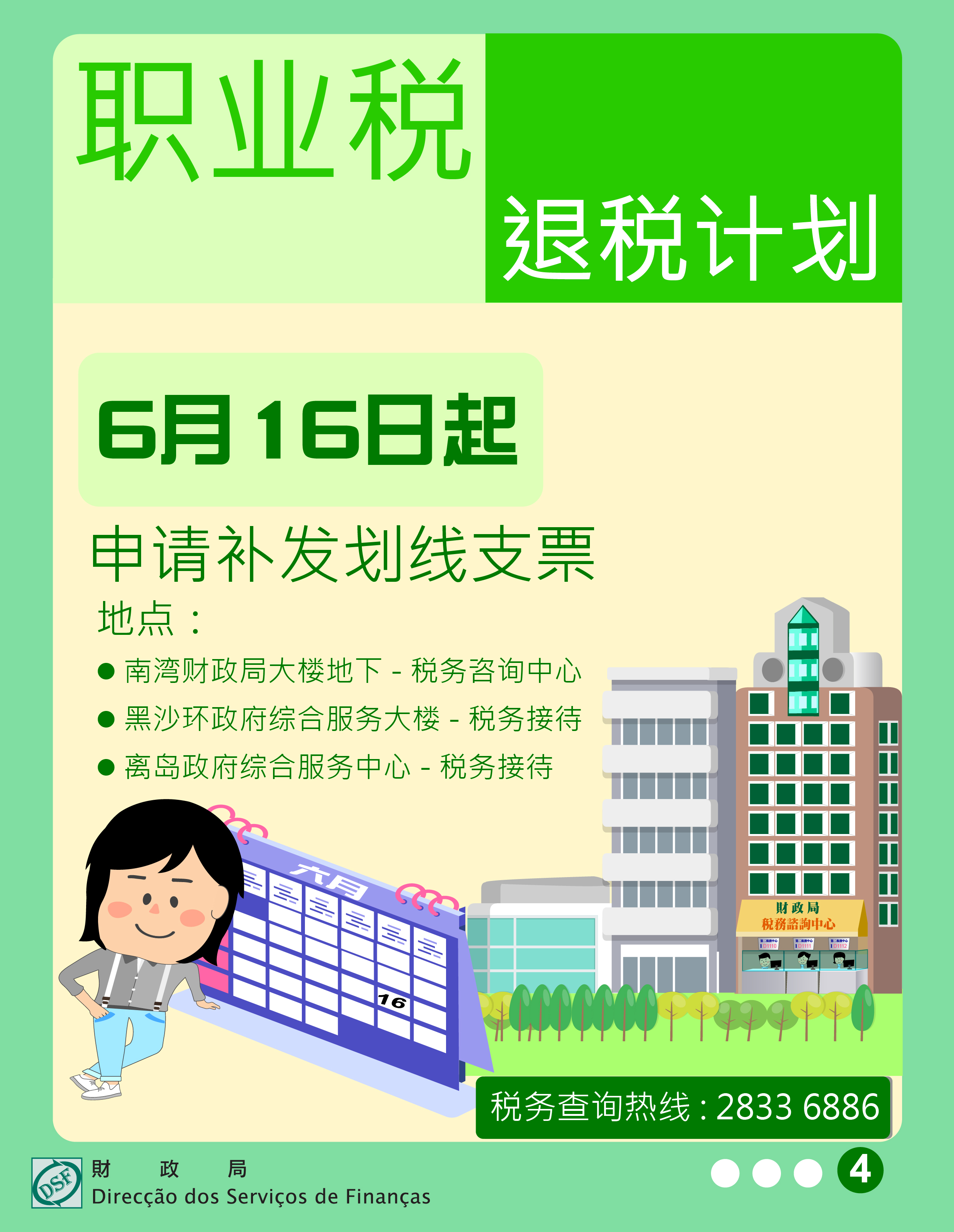 纳税人倘未如期收到2021年度职业税退税计划划线支票,又或遇遗失或损毁支票等情况,可自6月16日起到财政局各服务点申请补发支票。