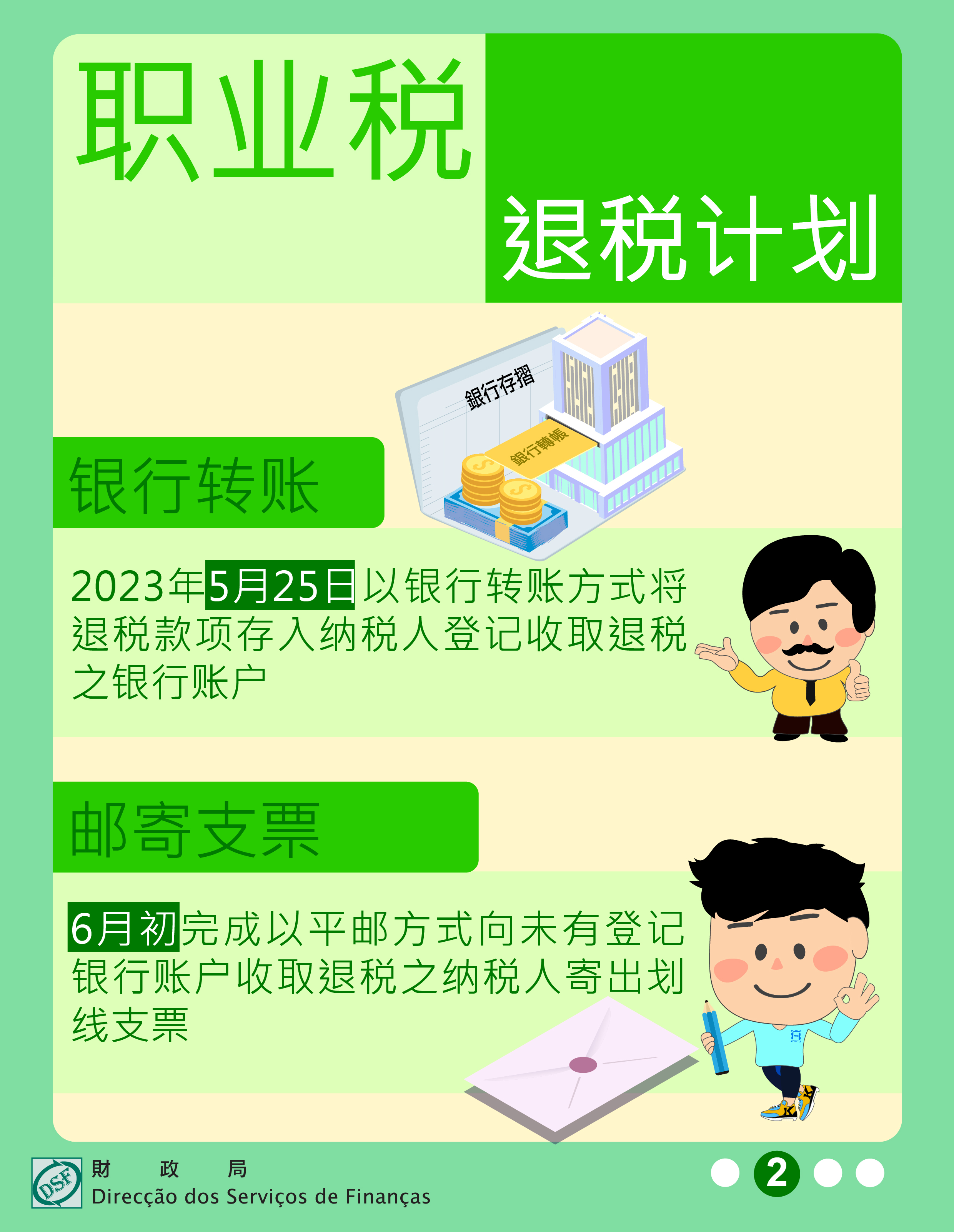 退税款项于5月25日透过转帐方式直接存入已登记的银行帐户内,而划线支票则会按照纳税人在财政局登记的税务通讯地址有序寄送,预计6月初完成寄送工作。