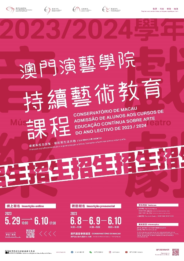 有意报读2023至2024学年各项音乐及戏剧持续艺术教育课程的人士,可于5月29日至6月10日期间登入网页www5.icm.gov.mo/consreg进行网上报名,或于6月8日至10日指定时间亲临高士德大马路14至16号澳门演艺学院报名。课程详情可于办公时间内致电2835 2766(音乐学校望德堂校舍)、2857 1207(音乐学校高士德校舍),2870 1588(戏剧学校)或浏览澳门演艺学院网页www.cons.gov.mo。