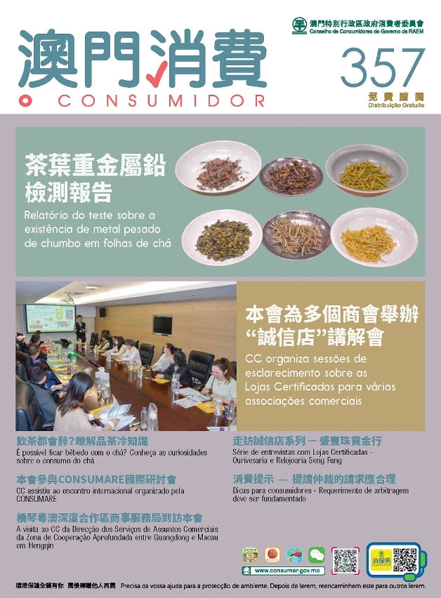 第357期《澳门消费》公布茶叶重金属铅检测报告,全部抽查样本符合本澳法规要求,未见异常。新一期《澳门消费》介绍消费者委员会与深合区及葡语系国家的消保合作交流。