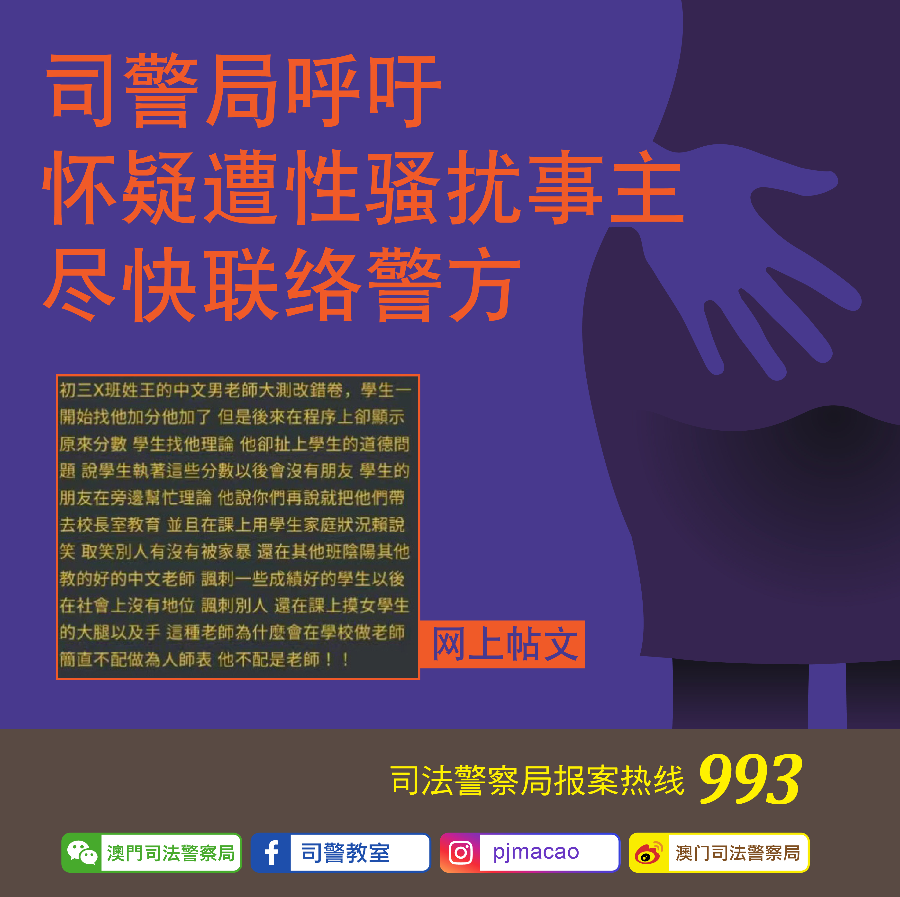 司法警察局现正就网上一则怀疑与性骚扰有关的匿名帖文进行调查,发帖者声称某学校有老师对女学生进行性骚扰。司警局暂未接到任何相关举报,呼吁事主或知情人士尽快致电993与局方联络。