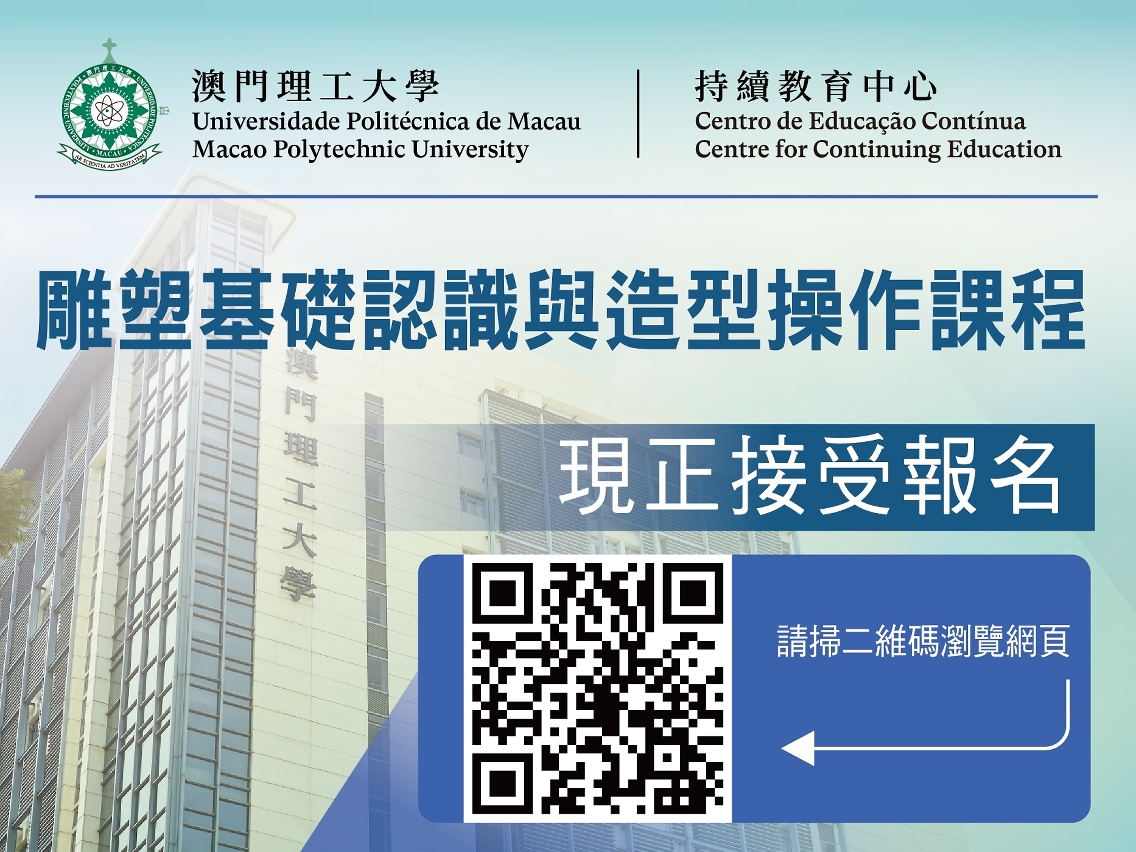 上述课程以广东话授课,招生对象为15岁或以上中学生或对课程感兴趣人士,可使用教育及青年发展局持续进修发展计划个人进修帐户支付,出席率达总课时85%并通过评测可获由澳门理工大学持续教育中心发出的证书。报读课程人士可透过网上报名或于澳门理工大学持续教育中心报名,“FUN DESIGN–理的设计”课程报名日期至2023年6月30日,“雕塑基础认识与造型操作” 课程报名日期至2023年7月21日,额满即止。有关课程资讯请浏览专页https://www.mpu.edu.mo/zh/cec_short_courses.php,查询报名手续可于办公时间致电87950832 / 87950750 / 87950707或电邮至cec@mpu.edu.mo。