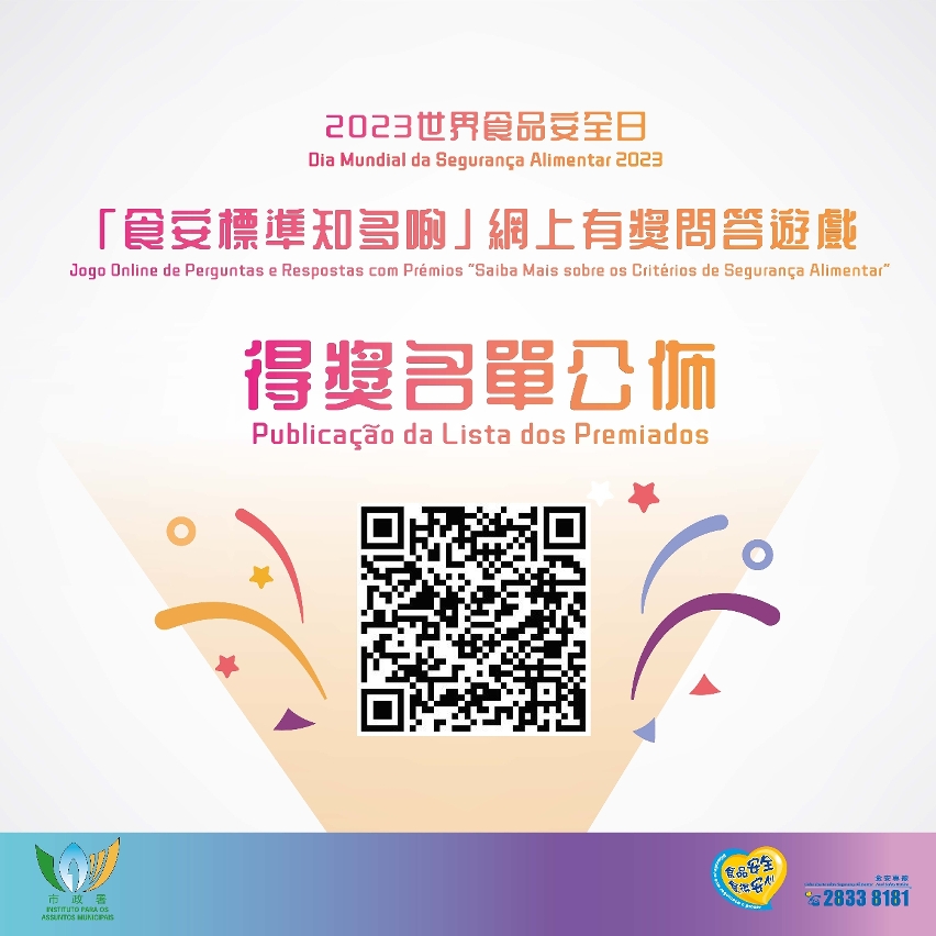 游戏得奖者可于七月三日起至七月十四日期间的办公时间内,带同身份证明文件正本前往佑汉小贩大楼一楼市政署食品安全厅业界专区领奖。如由他人代领,须于食安资讯网下载及填妥授权书,并于领奖时出示代领人的澳门居民身份证正本及得奖者的澳门居民身份证副本。逾期视作放弃,并由候补名单依序补上。如有疑问可致电市政署食安专线2833 8181查询。