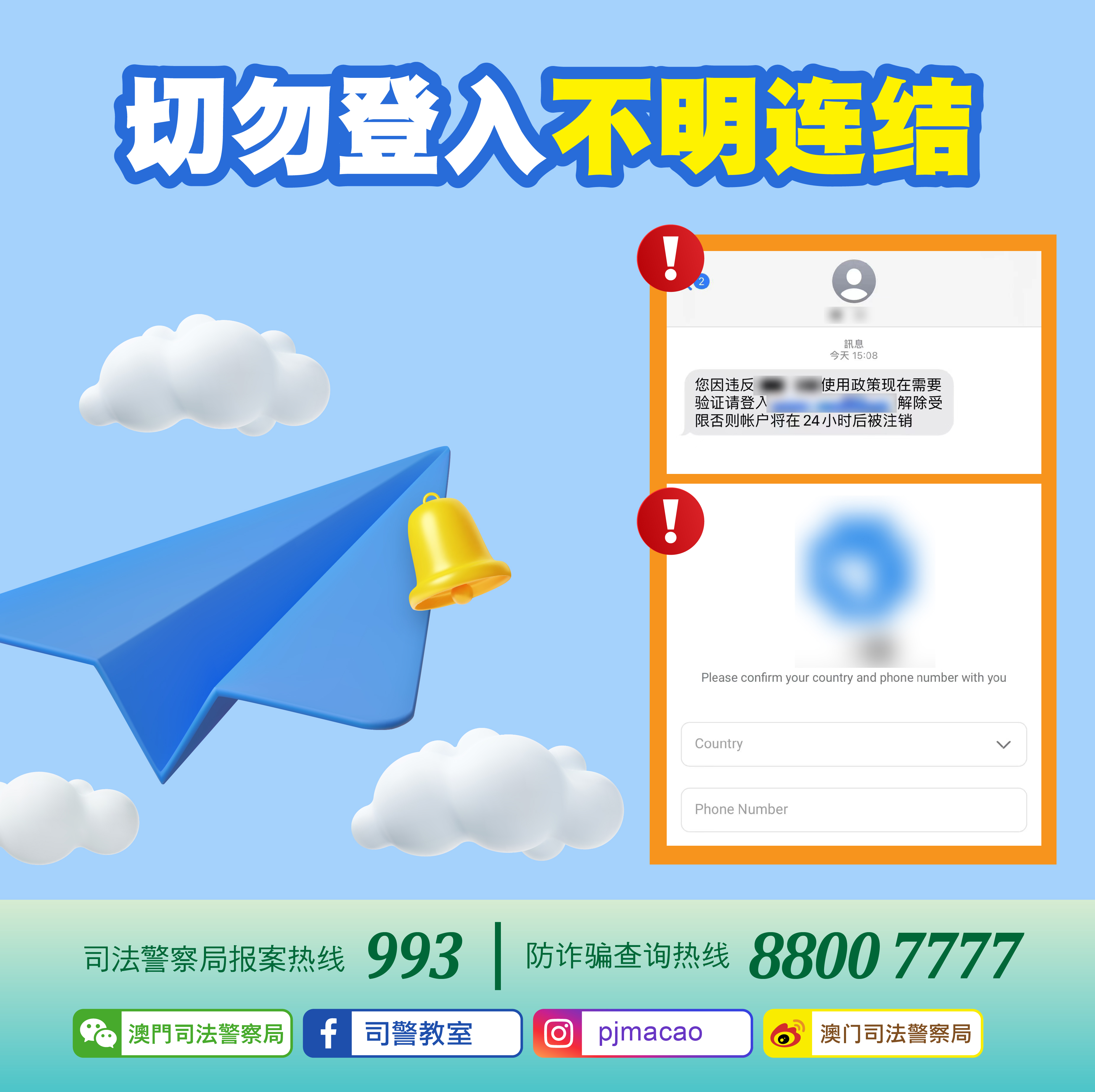 鉴于近年有不法分子透过上述手段盗取市民通讯软件帐户后,再向该帐户内的“好友”进行诈骗,部分案件更造成财产损失。为此,司警局呼吁市民须提高警惕,切勿点击来历不明的短讯连结,应循官方渠道确认短讯内容的真实性,以及留意连结的网址是否与官方网站完全相符,切勿轻易提供个人帐户或验证码等资料。如怀疑遭到诈骗,应立即致电司警局防诈骗查询热线8800 7777 或报案热线993 求助。