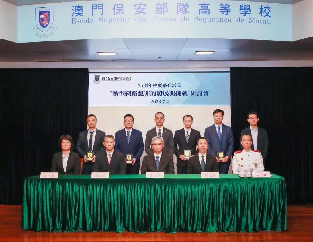 7月4日,为澳门保安部队高等学校(下称“保安高校”)三十五周年校庆,于上午八时正在保安高校举行升旗仪式,其后举办了校庆系列活动─“新型网络犯罪的发展与挑战”研讨会;研讨会的开幕仪式由保安司司长黄少泽主礼,并邀请到由中国人民公安大学副校长李守德带领的内地公安教育代表团一行八人、由中央司法警官学院党委副书记刘建会带领的代表团一行五人、警察总局局长梁文昌、澳门海关关长黄文忠,以及保安范畴辖下领导和各级人员代表出席。研讨会以“新型网络犯罪的发展与挑战”为主题,并邀请到来自内地、香港及本澳的学者专家发表文章,内容涵盖人工智能、网络犯罪、电讯诈骗及网络安全等多个方面;研讨会除设有现场参与外,亦在各保安部队及保安部门设线上直播点,参与是次研讨的人数共约370人。