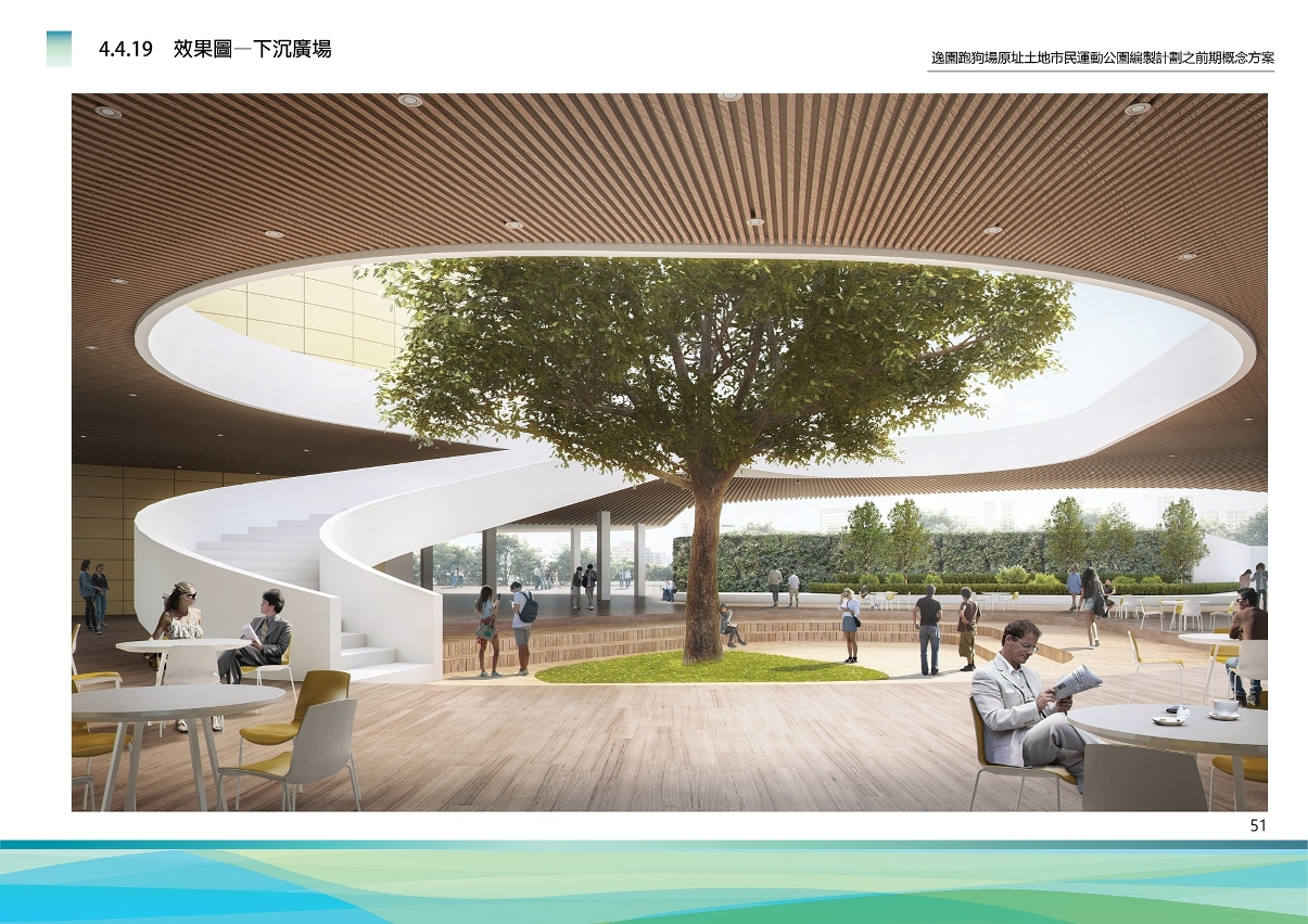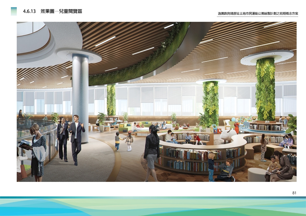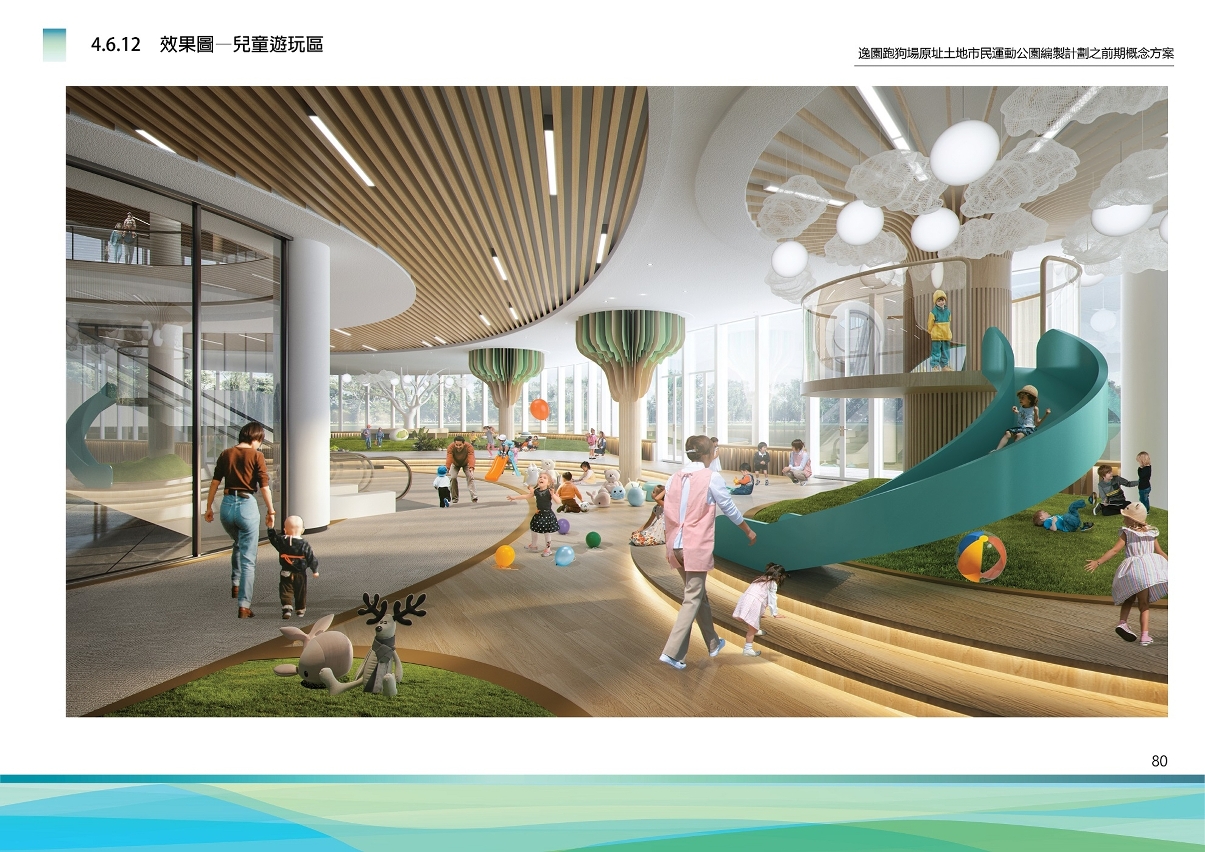 儿童活动中心:靠近地段南侧,楼高四层,集中儿童活动需求。考虑到游玩空间的遮阳及场地空间需求,及全天侯仍能使用。儿童活动中心底层室内空间为展览区,一楼为创意教学区,二楼为室内游玩区,户外以无障碍平台连接至市民运动公园—2号馆的平台。三楼为阅览区,设有室内外阅览区,提供丰富阅读体验。