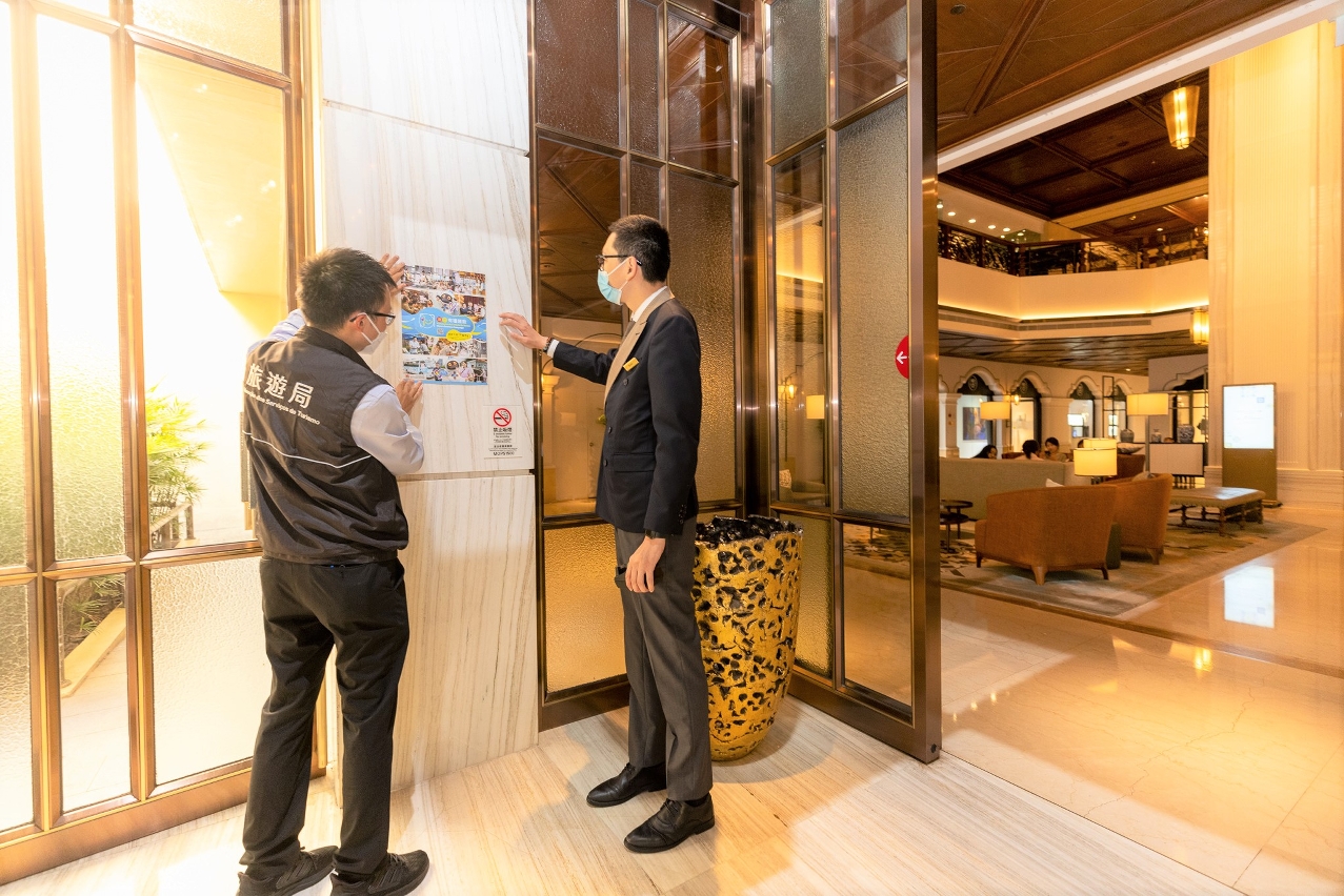 旅游局陆续向“星级旅游服务认可计划”获奖商户派发设有“旅游大使 你我都是”口号的“星级旅游服务认可计划"襟章;向业界发送“澳门有礼运动”宣传资料下载连结及二维码,以便业界协助宣传推广;也在业界培训活动播放宣传短片和向学员派发宣传品,增强旅游及相关业界有礼待客的意识;向全澳酒店业场所及其内场所派发宣传海报;于巡查受监管场所包括酒店、餐厅、酒吧和旅行社等期间派发宣传海报,透过业界向从业员推广以礼待客的讯息,广传好客之道。